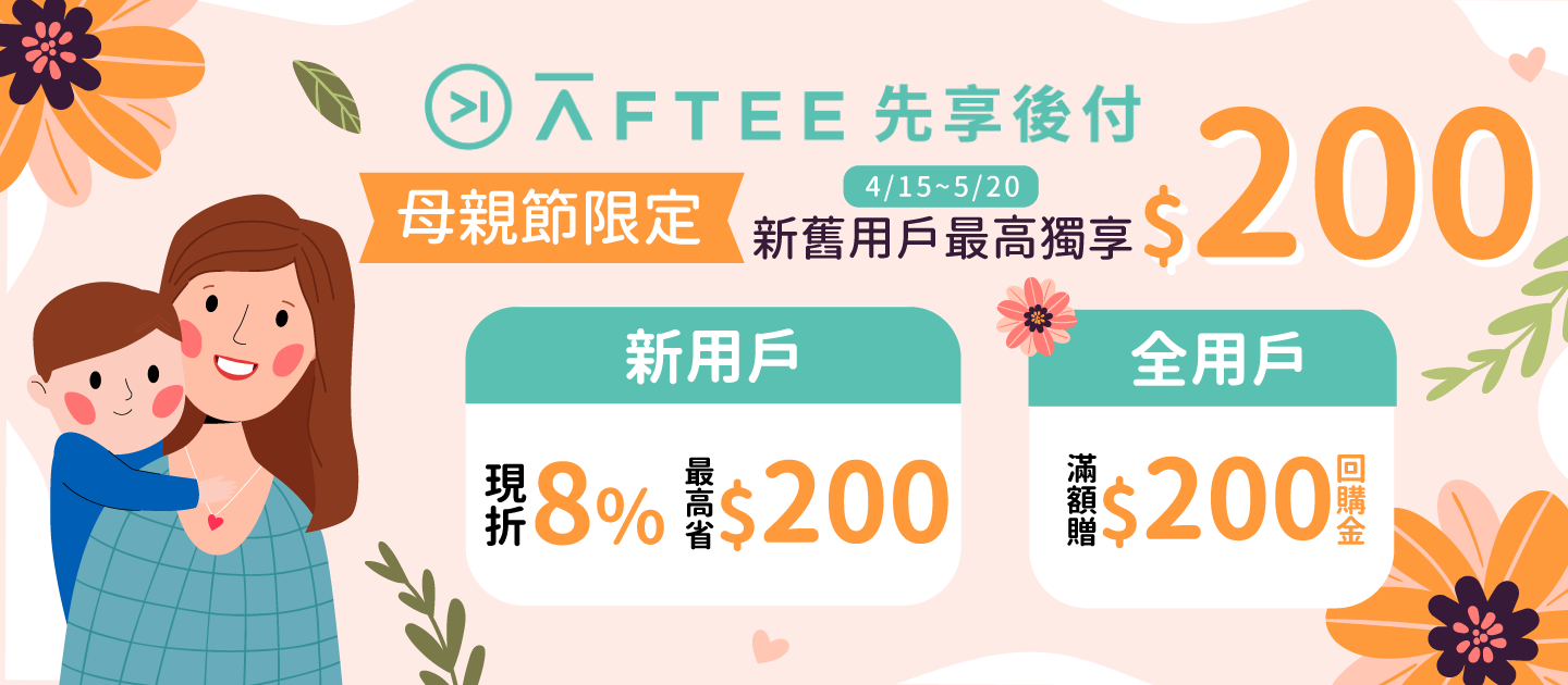 【活動說明】AFTEE 先享後付 母親節限定優惠 2026/4/15~5/20