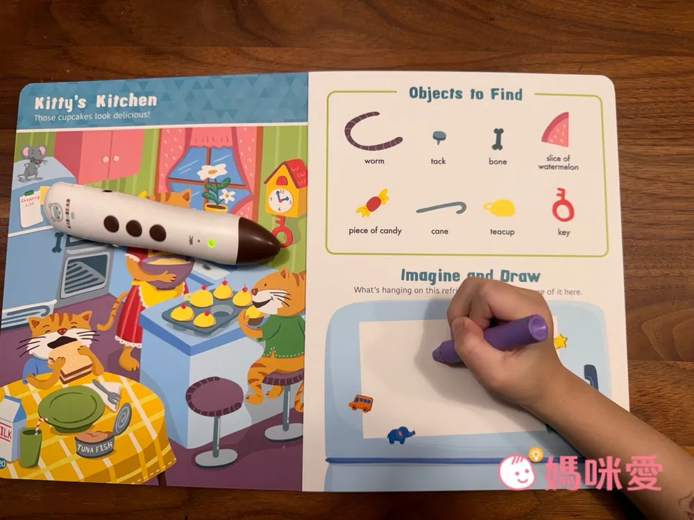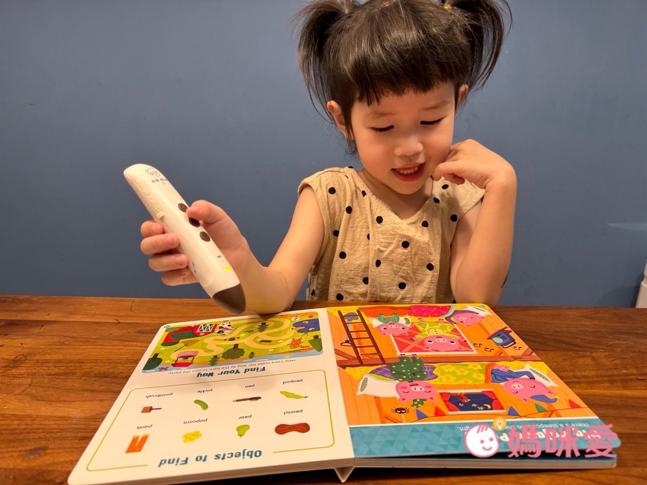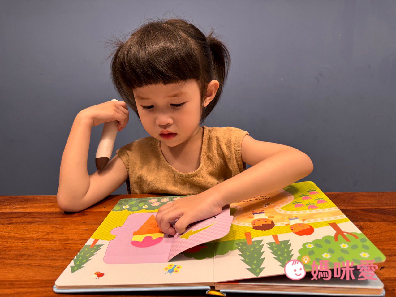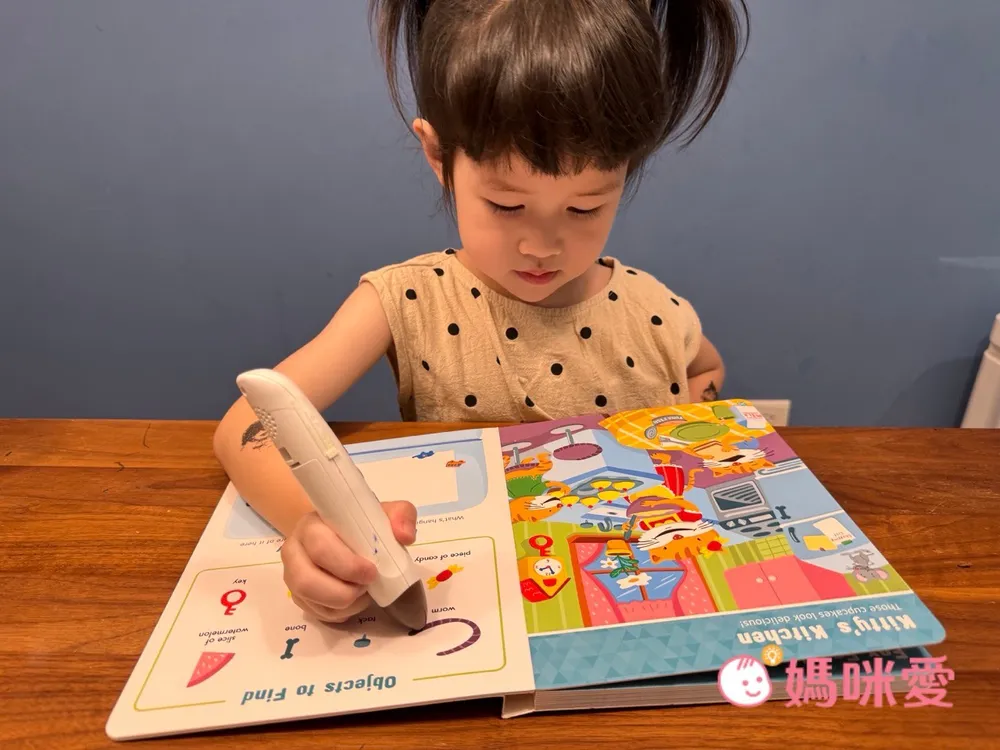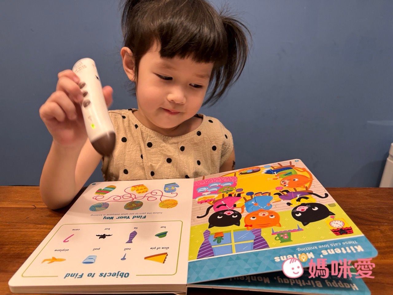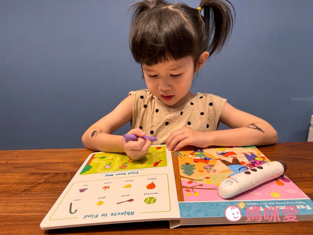 對於4歲的芙咪來說不會覺得太簡單,反而帶有一點挑戰。剛開始在閱讀時,她會嘗試去點讀認識英文單字->然後跟著念->再去找圖畫中的物品,有種邊找單字邊尋寶的概念。但偶爾還是會向哥哥求救說:找不到⋯它藏在哪裡呢?