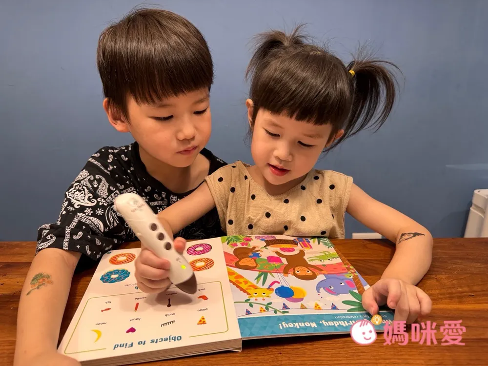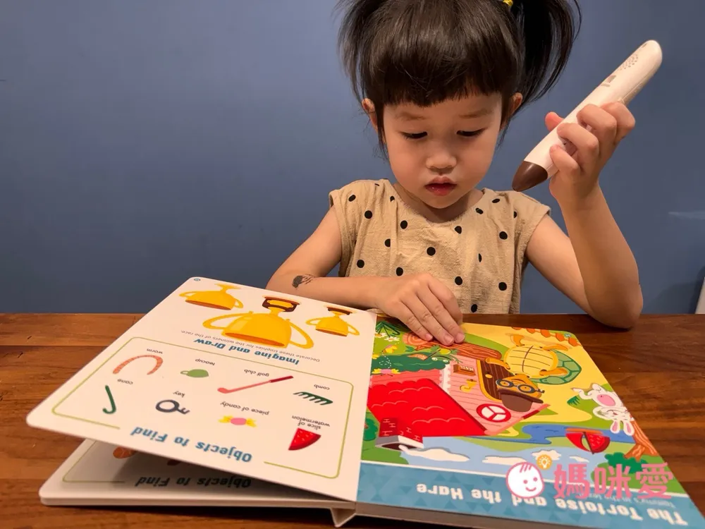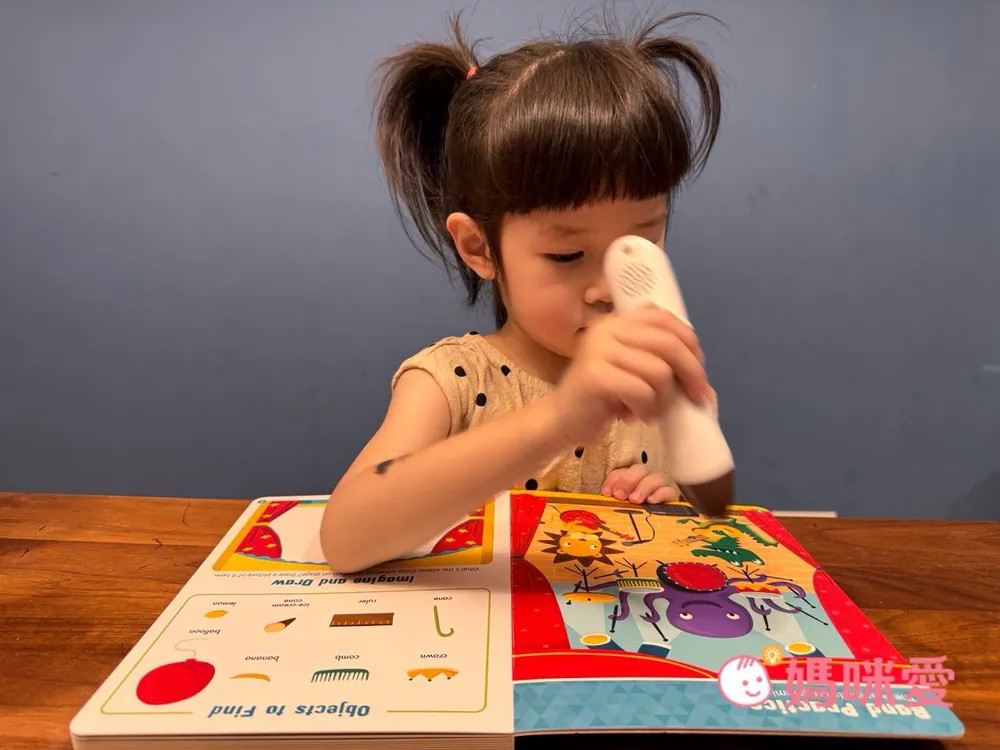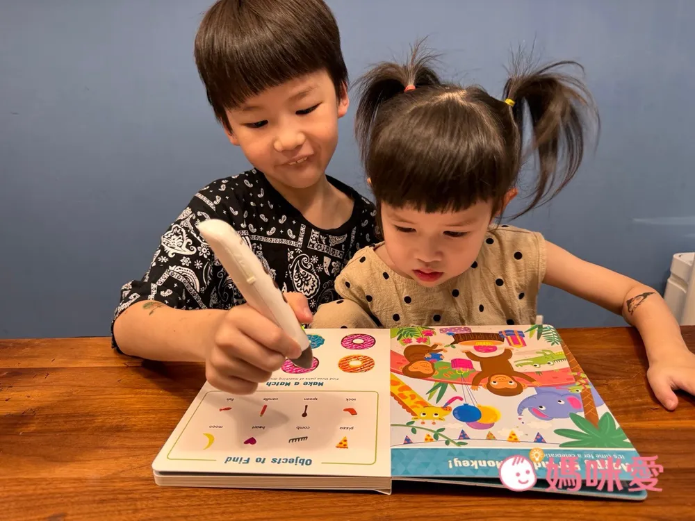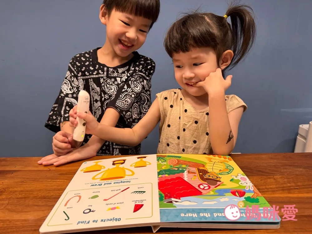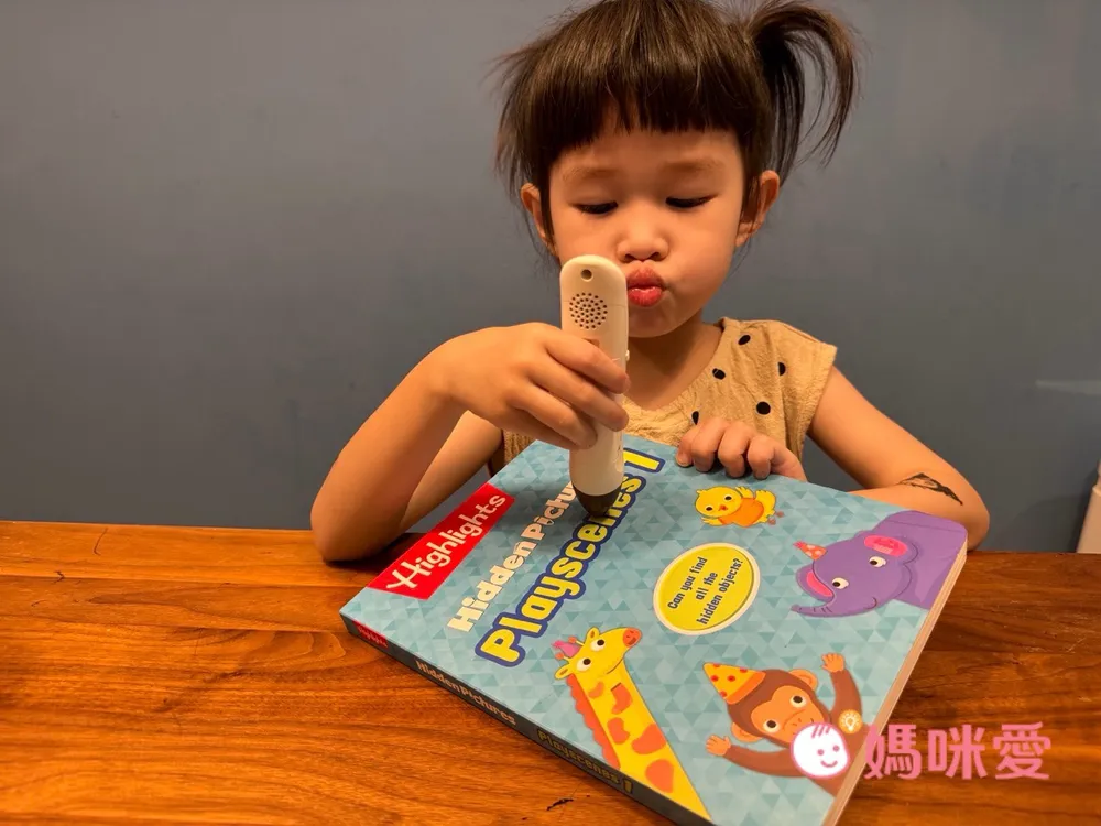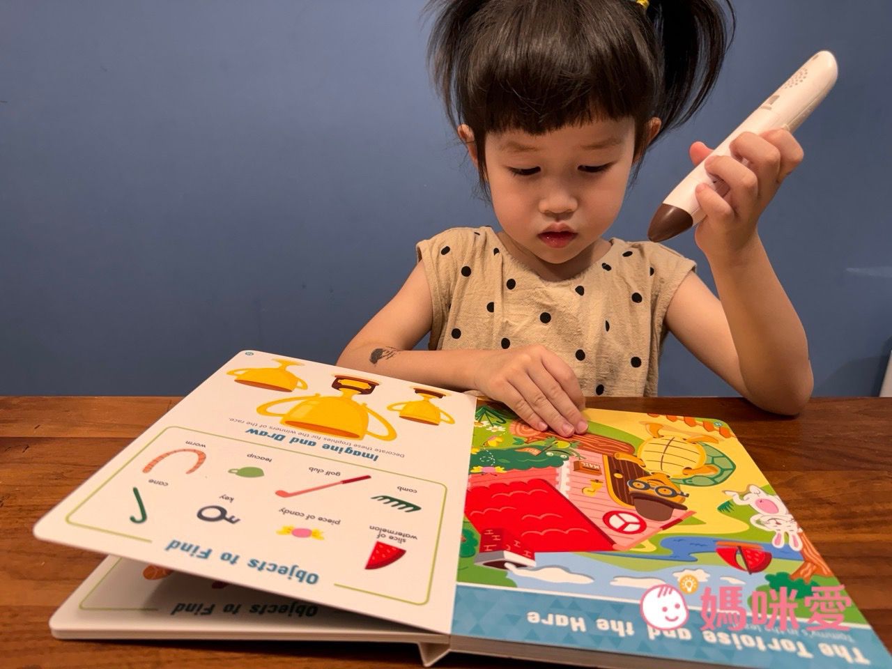 對於4歲的芙咪來說不會覺得太簡單,反而帶有一點挑戰。剛開始在閱讀時,她會嘗試去點讀認識英文單字->然後跟著念->再去找圖畫中的物品,有種邊找單字邊尋寶的概念。但偶爾還是會向哥哥求救說:找不到⋯它藏在哪裡呢?