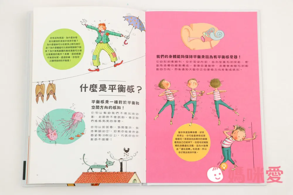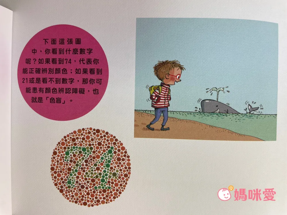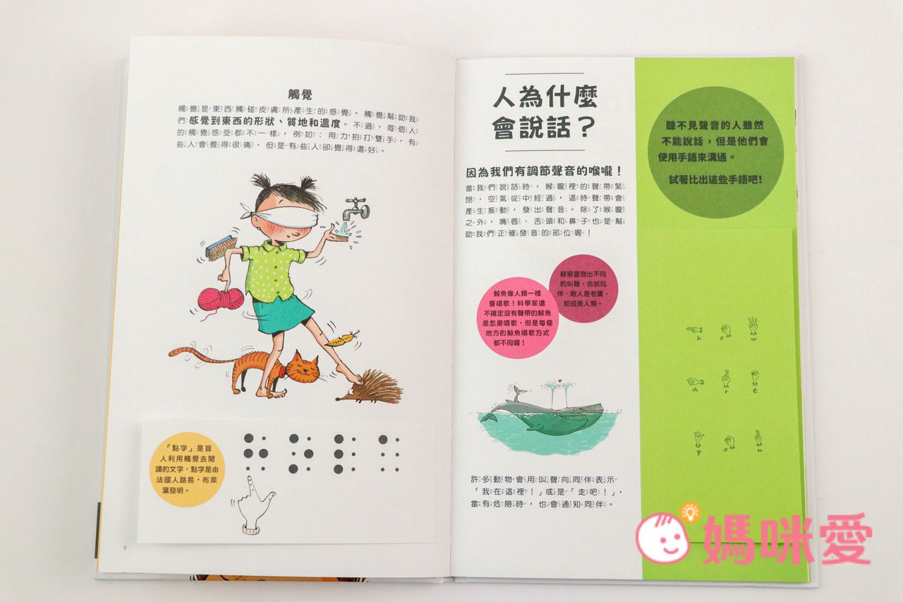 這本則是關於身體和外面世界的探索繪本,打開後將會知道:如果把鼻子塞住,會發現吃什麼東西都沒有味道;皮膚的表面積大約有一條圍浴巾這麼大,重量大約3公斤⋯等知識。
