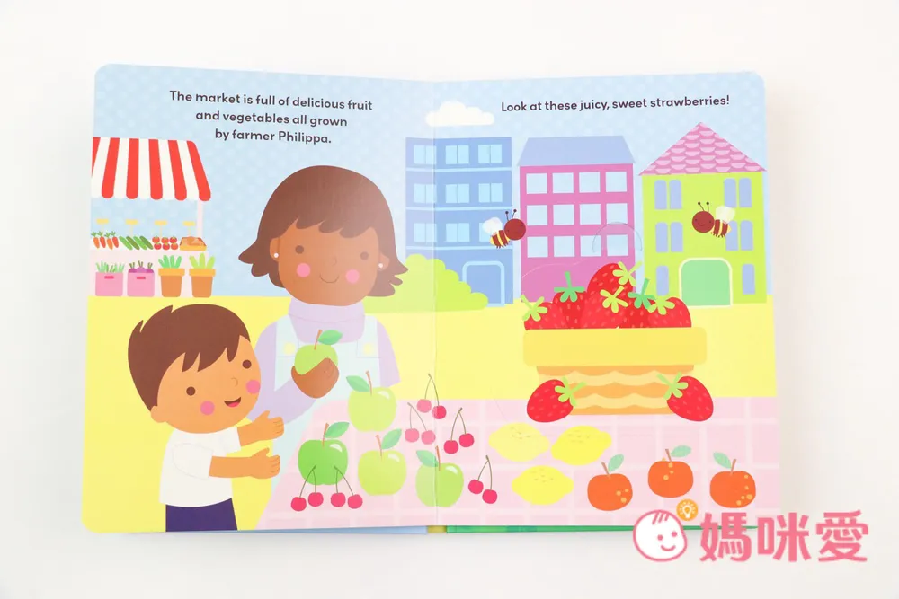 『市場上擺滿了農民菲利帕種植的美味水果和蔬菜。看看這些多汁、香甜的草莓!』