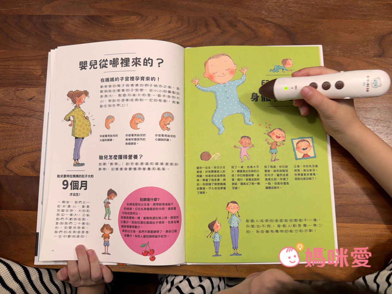 嬰兒從哪裡來的?|在媽媽的子宮裡孕育來的!胎兒需要待在媽媽肚子裡約9個月才出生;右頁則是提到兒童期的身體變