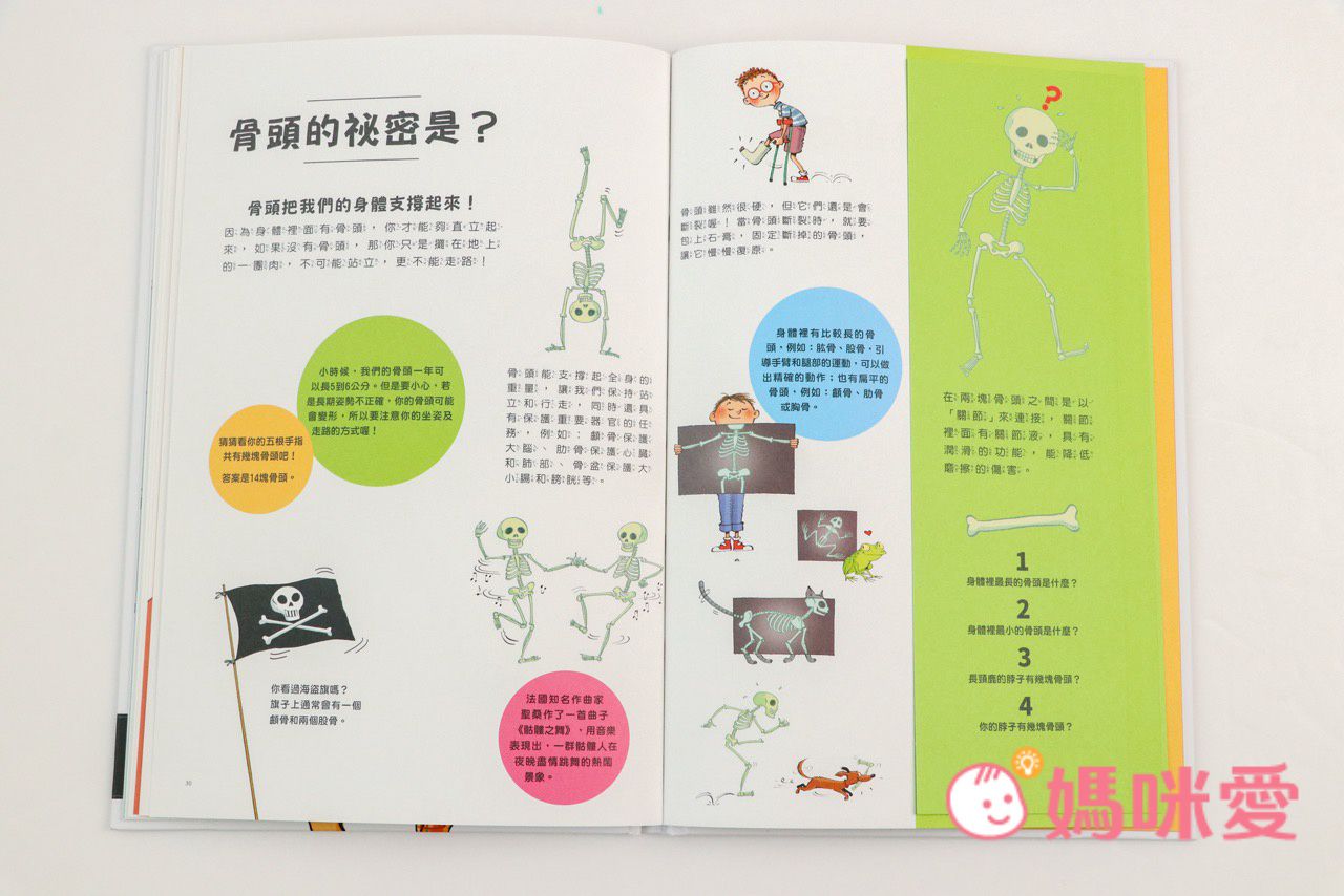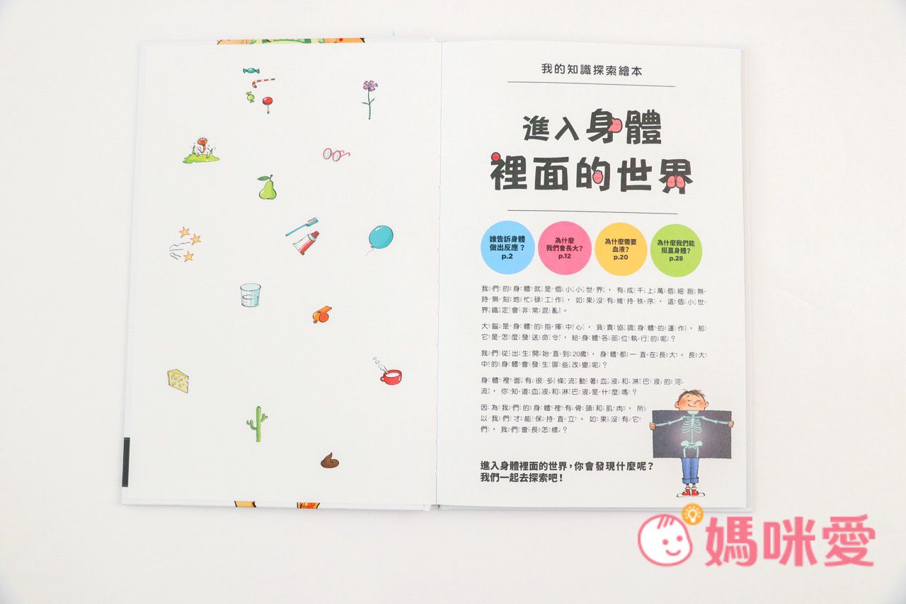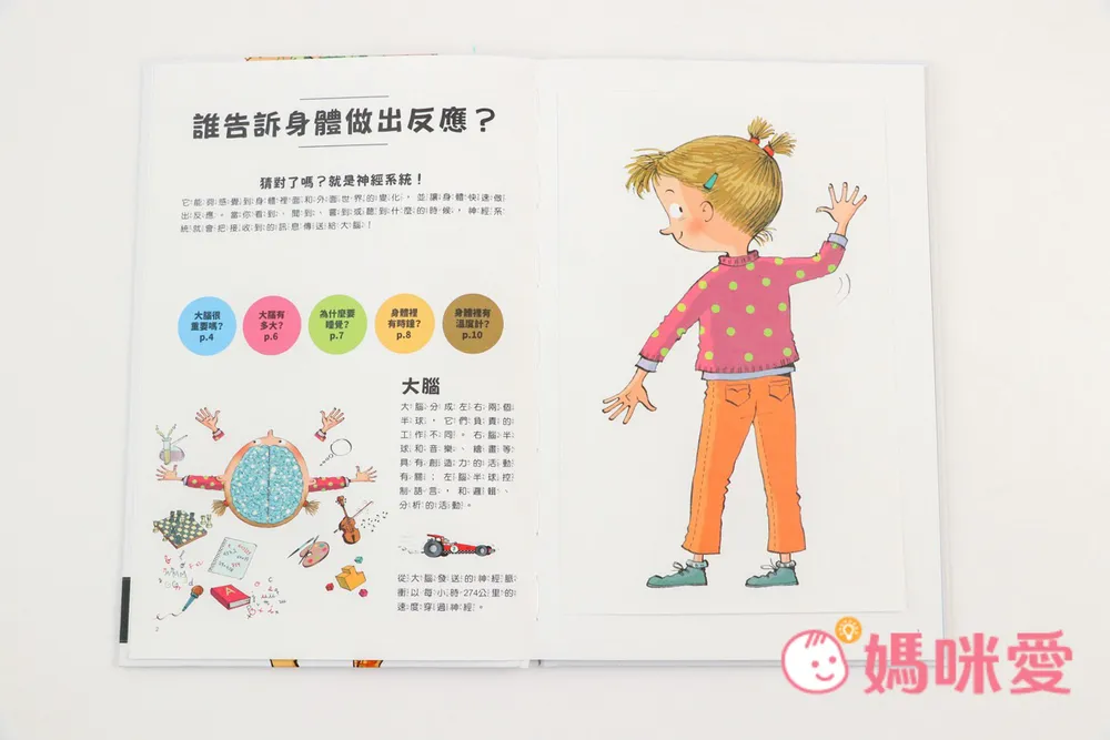 來到第一頁右邊的小目錄,它分為4個大主題:「誰告訴身體做出反應?」「為什麼我們會長大?」「為什麼需要血液?」「為什麼我們能挺直身體?」。而這4個主題裡面會再分支3~5個以上問題做探討,內容可說是非常非常豐富!