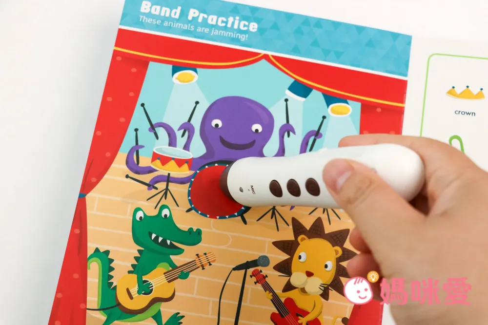 來到第一個主題是『Band Practice樂團練習』。基本上左圖的部分點讀動物都會有專屬旁白聲,顯得故事情節更有趣了~!重頭戲就是右邊這8個插圖(皆為找找遊戲的題目)。
