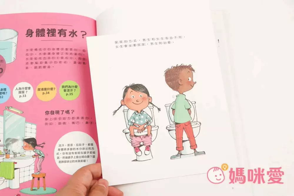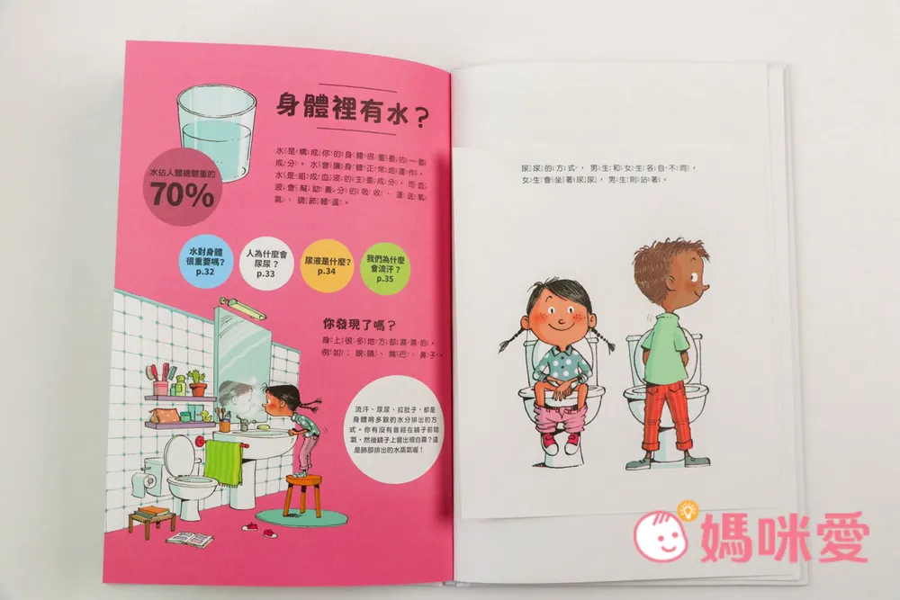 另外尿尿的方式,男生和女生各自不同,女生會坐著尿尿,男生則站著。翻開翻翻頁可以看到男生女生內部泌尿器官、泌尿系統。