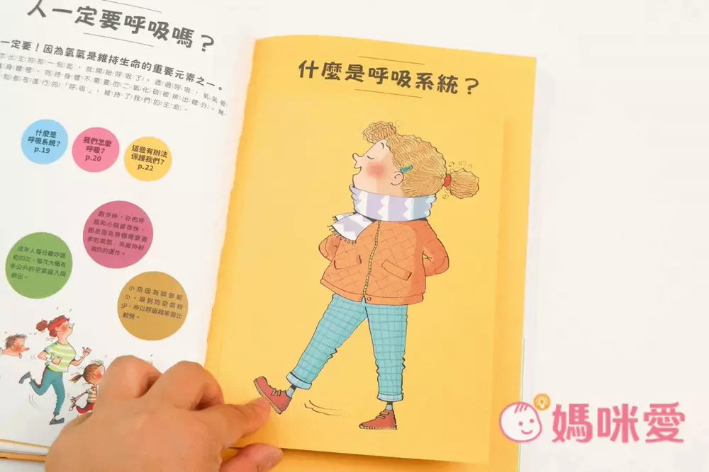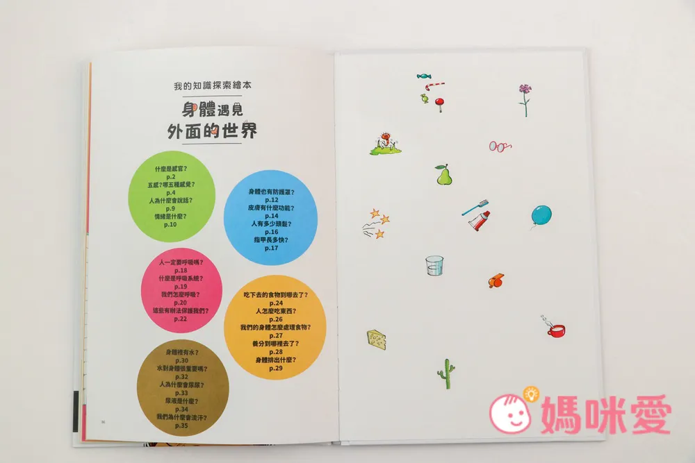 目錄又分為5個題目「什麼是感官?」「身體也有防護罩?」「人一定要呼吸嗎?」「吃下去的食物到哪去了?」「身體裡有水?」![]()