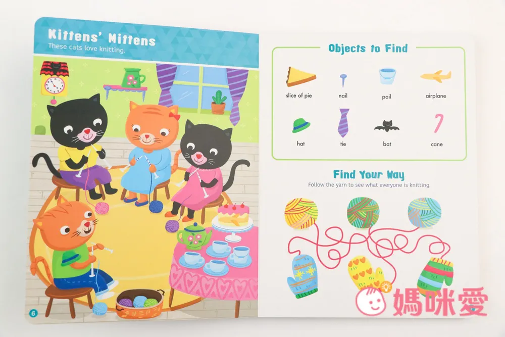 『Kittens' Mittens 貓咪的手套』這些貓咪喜歡編織。每一頁的玩法操作都相同,唯一不同的地方在於右下角的延伸遊戲。像是樂團那頁的延伸遊戲是想像&繪畫;猴子那頁則是連連看;而貓咪這頁有點像是走迷宮,從散落中的毛線找出毛球相對應的手套。