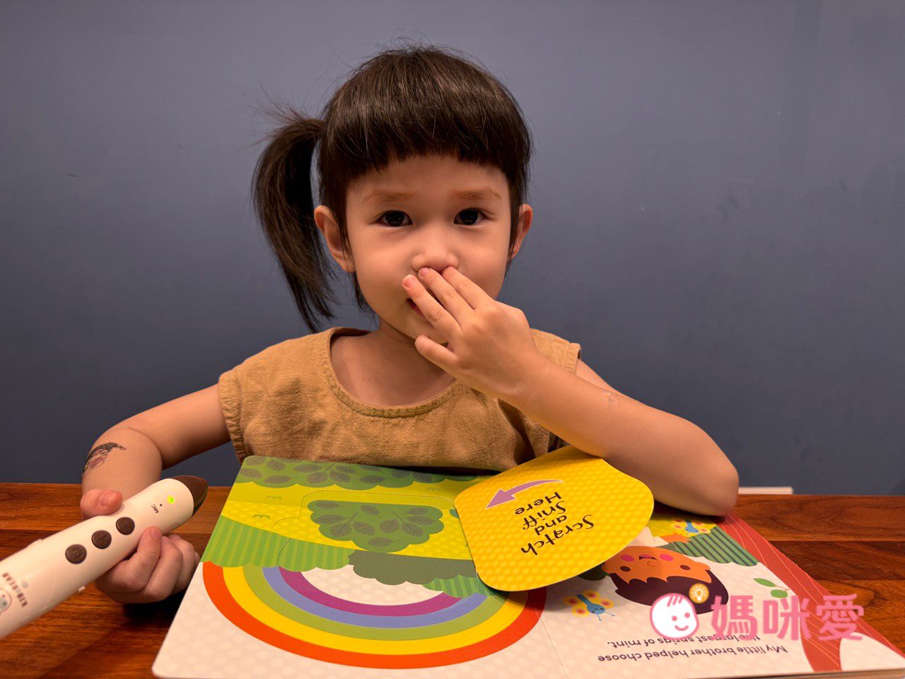媽咪覺得這本書又再次開啟了孩子對於閱讀的好奇心!因為有單純情境故事可以學閱讀、有真人扮演錄音學對話還有各種物件名詞學單字,重點是透過聞氣味來認知的書真的非常有趣哦!
