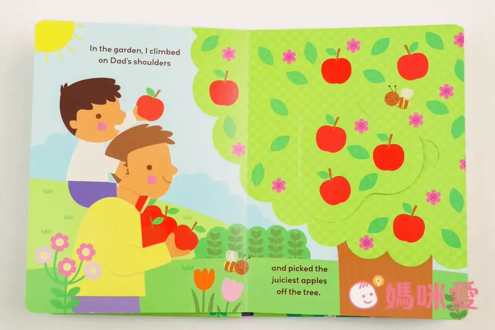 『在花園裡,我爬到爸爸的肩膀上,並從樹上摘下了最多汁的蘋果。』