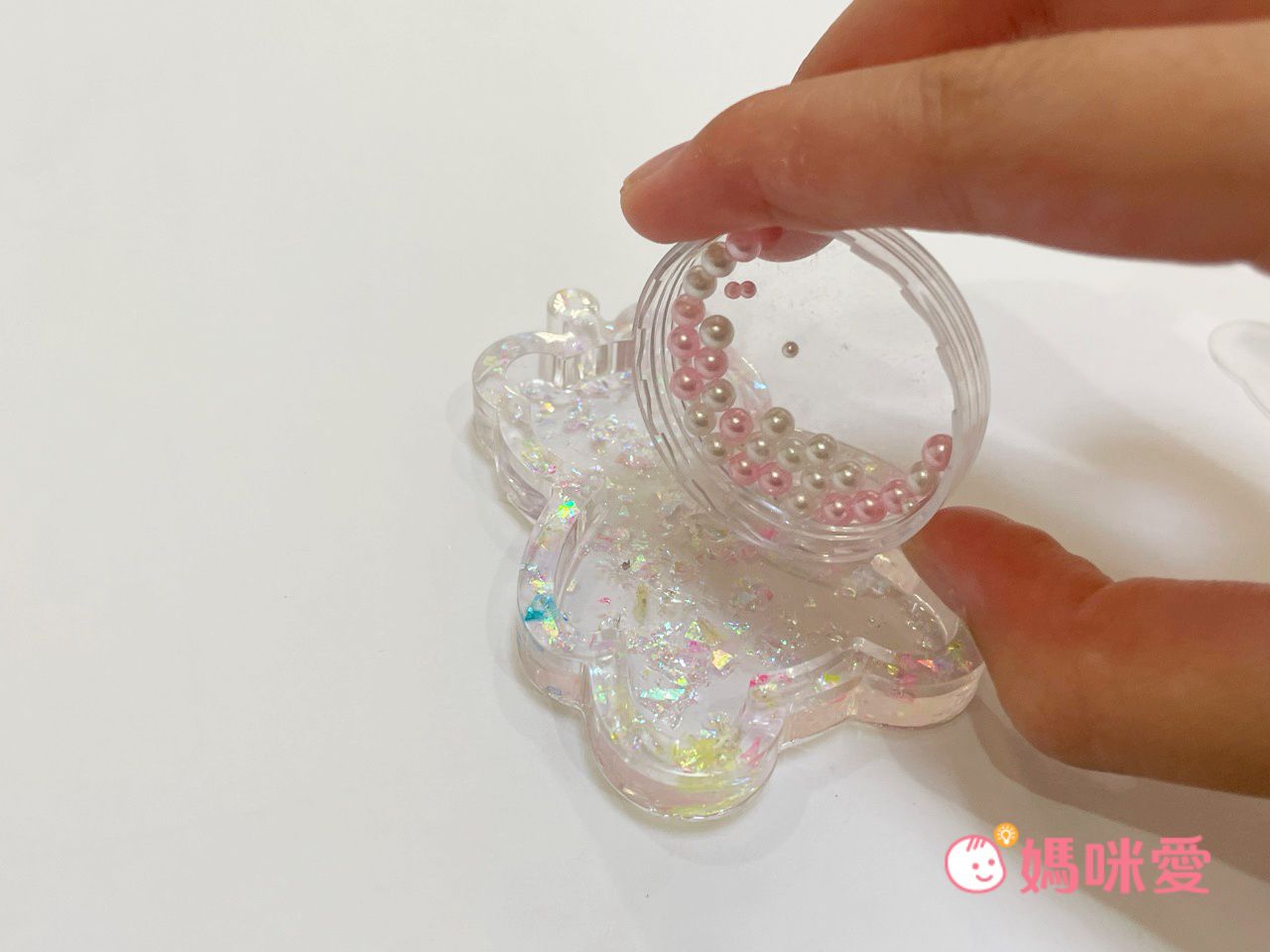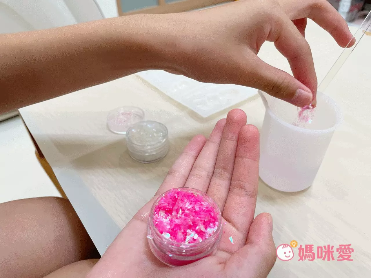 再來就可以加入自己喜歡的亮片與小材料~添加完後再攪拌一下,讓亮片分佈更均勻!