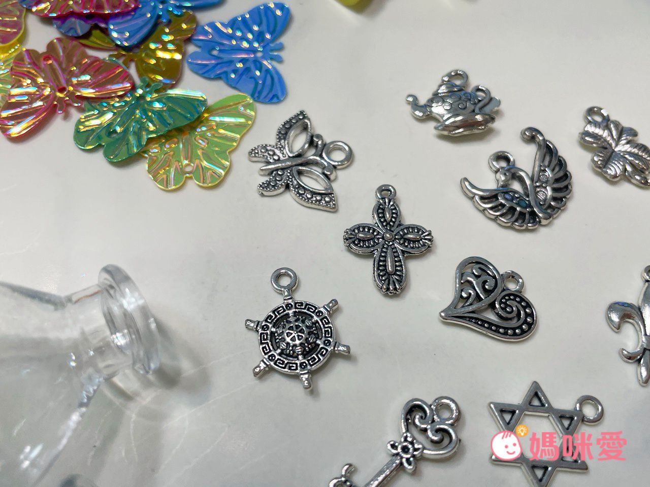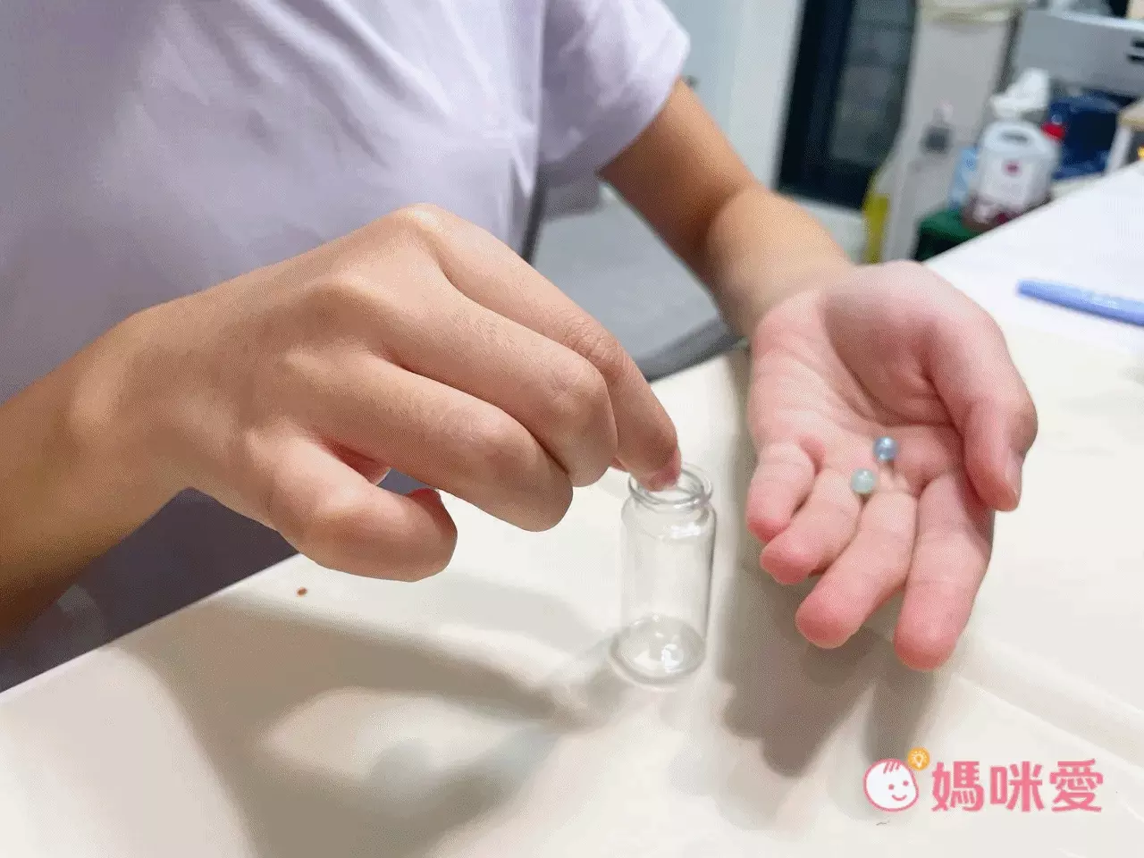 接著挑選一個喜歡的瓶子形狀,將剛剛攪拌好的亮片倒入瓶中,另外可以再加點液體顏料、珠子(會發光),會讓成品更吸睛哦~