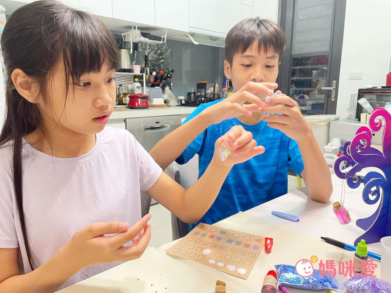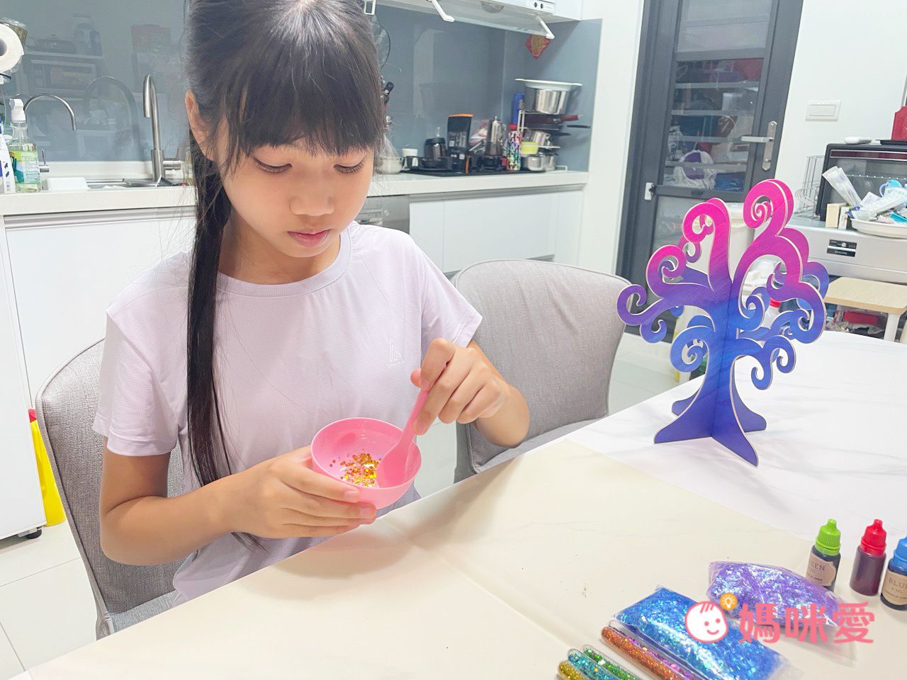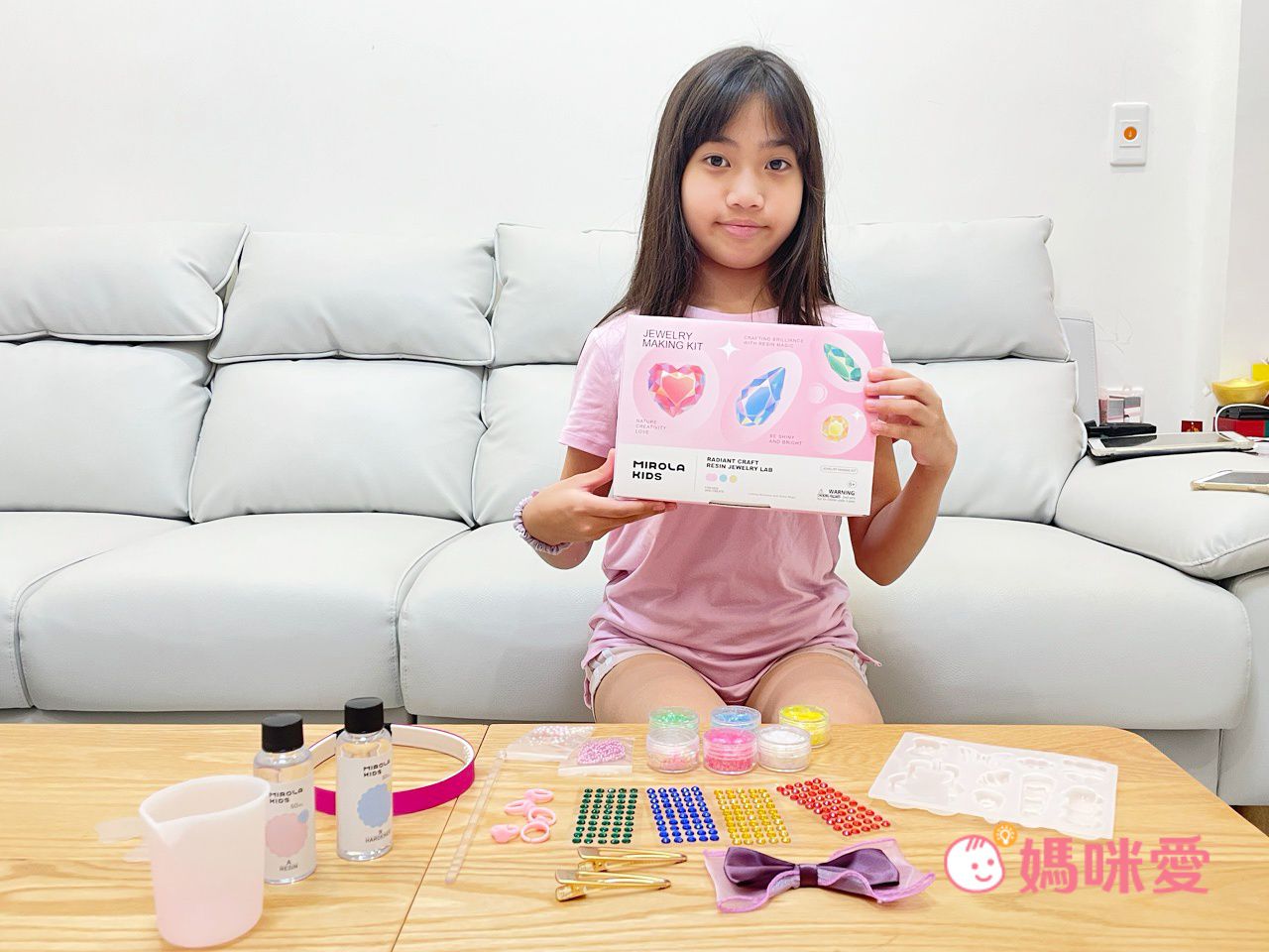 哪個女孩能抗拒閃亮亮的飾品呢?甚至可以自己親手做獨一無二的飾品!媽咪收到「兒童閃耀樹脂套組」後先藏起來,原本想說給霈霈一個驚喜,結果下班回到家,它已經被挖出來了><果然女孩的時尚雷達,非常敏銳!