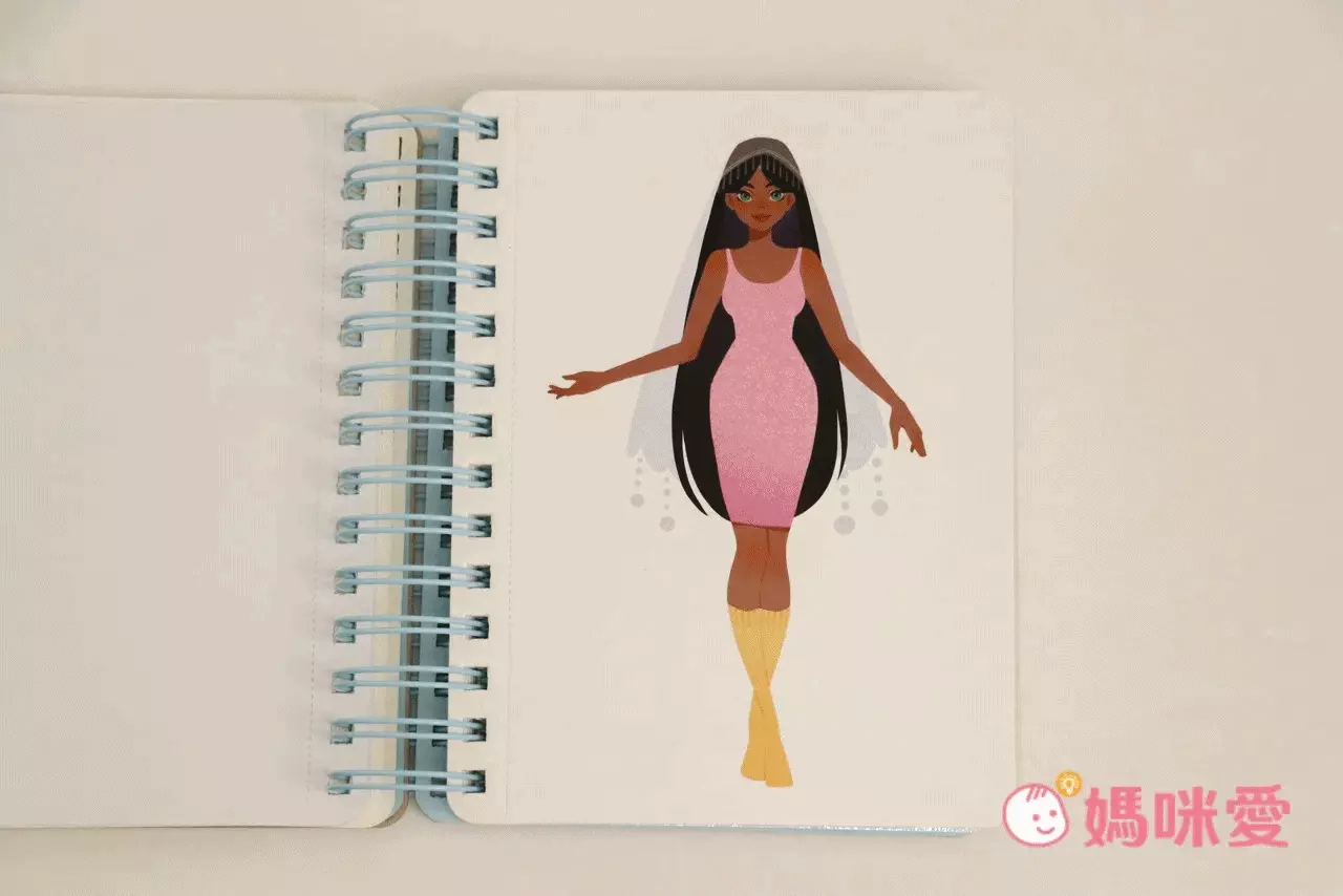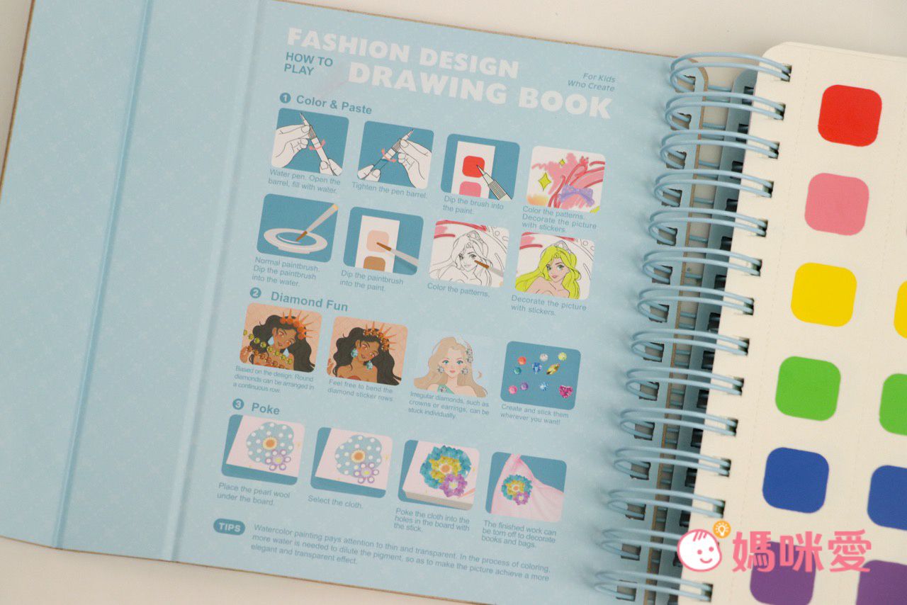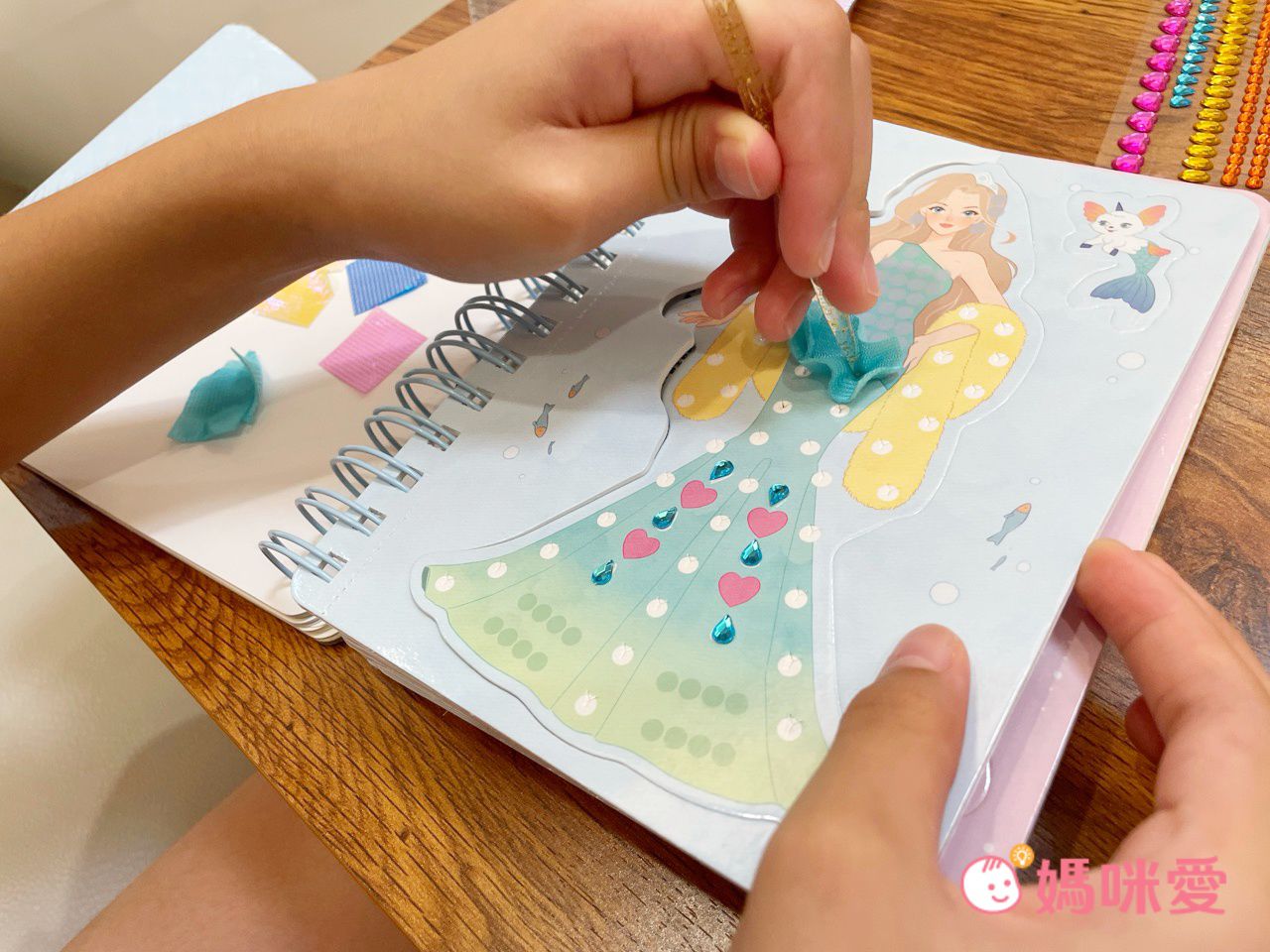 《時裝設計繪本-魔法公主》的玩法有:繪畫(自製書籤)、貼紙(用貼紙幫公主裝扮)、戳戳繡(設計屬於自己的裝飾)。