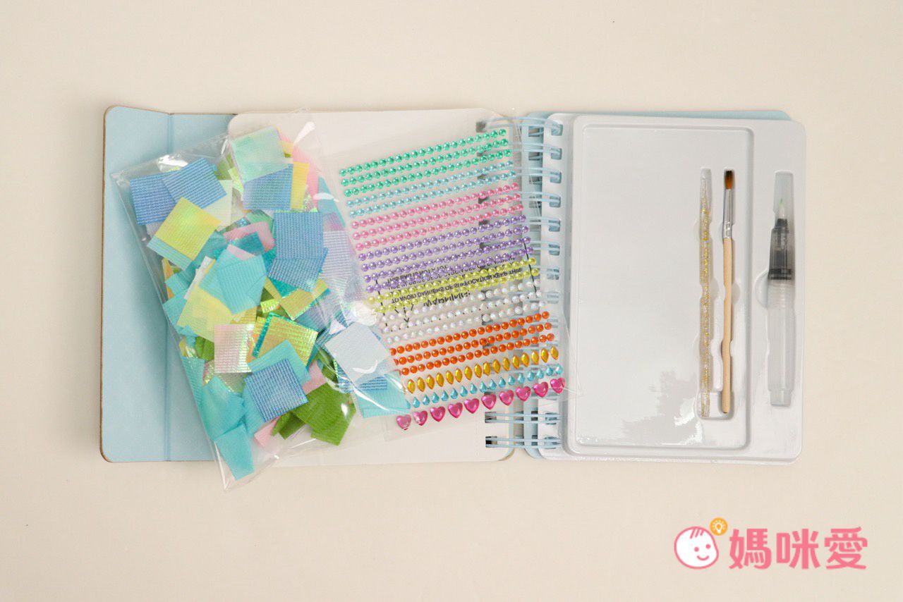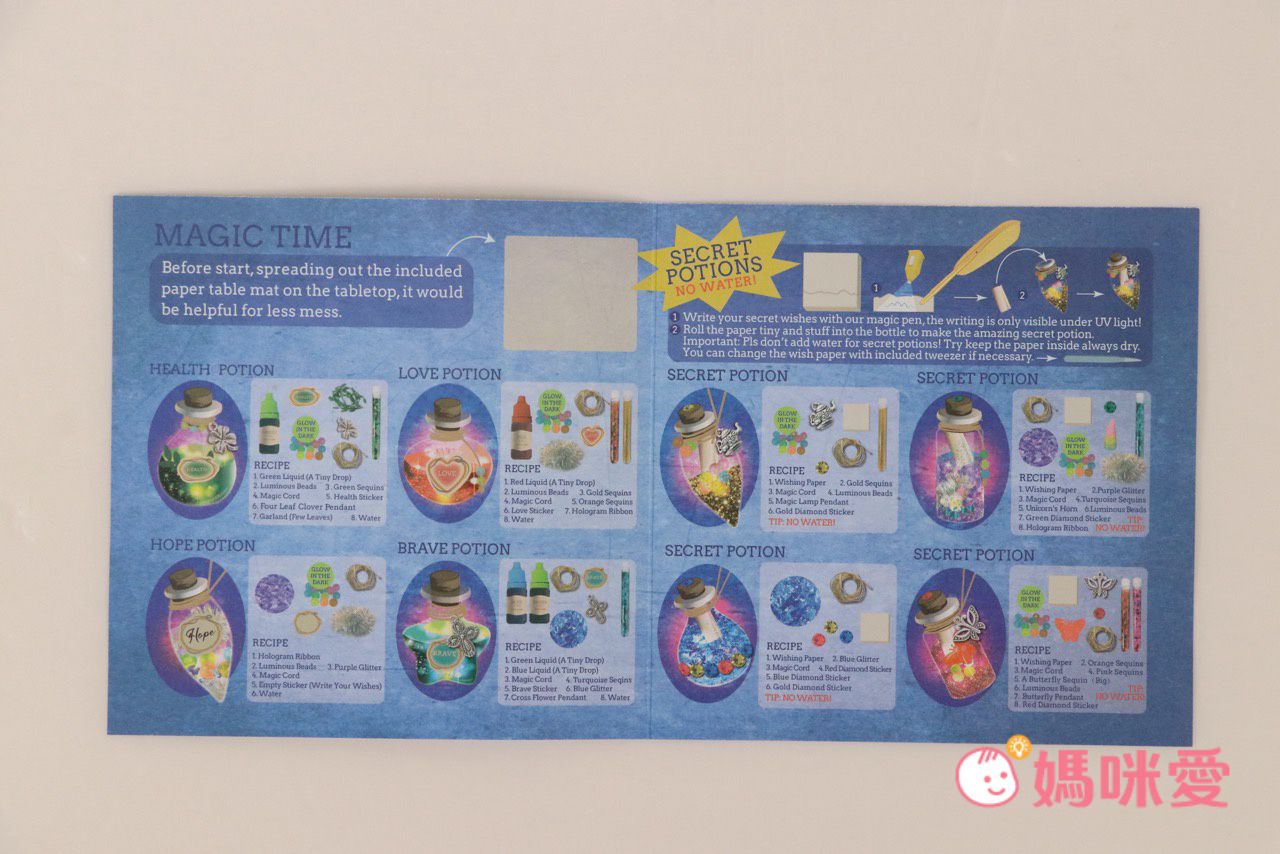 令媽咪覺得最貼心的設計竟然是『一張大紙』!畢竟製作藥水會用到許多亮粉亮片及顏料,為了避免"桌上有災情",只要從盒子裡拿出這張大紙,鋪在材料下方,相信大家的桌面都會平安無事(很好清理啦)~