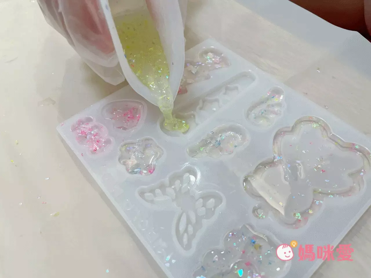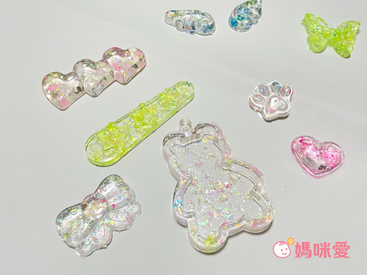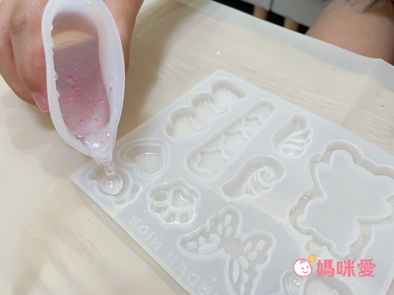花型填充物也可以直接放入模具,再倒入混合好的液體,這樣做出來的成品,又是另一種感覺。媽咪覺得模具裡不一定只能放盒裡所附贈的小物件,如果家中有亮粉、亮片、小珠珠等小物應該都可以放進去(物件放進去不要比模具高就行XD)