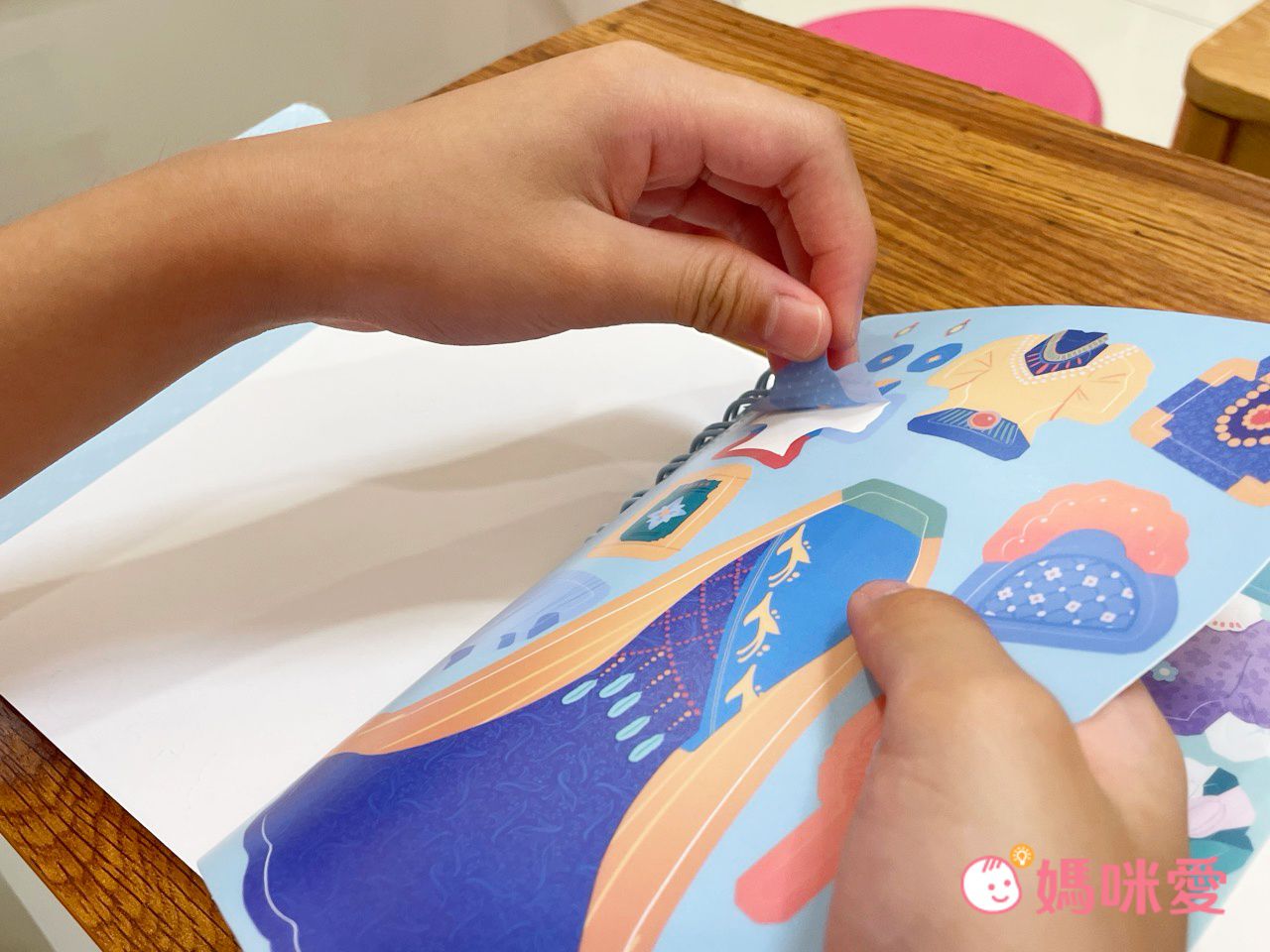 翻到書中間就可以來玩玩變裝貼紙!一共有兩款人物+3張變裝貼紙。多變的服裝造型與配件,讓孩子動動手部肌肉,訓練手眼協調~