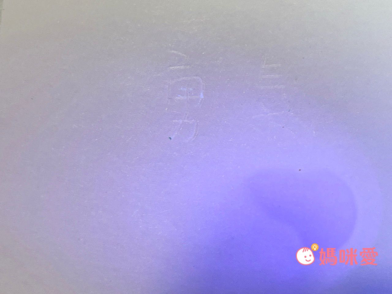 這時會發現其實羽毛筆是一支完全沒有墨水的筆。用羽毛筆寫出來的字,只能在紫外線燈下看的見!用盒中附的紫外線小燈一照,原來霈霈寫的是『勇氣』啊!此外這個設計也讓媽咪覺得很暖心,也許是為了讓孩子能更安心、更有隱私的寫下自己的秘密願望,又或者單純是想讓『魔法』更加顯著~
