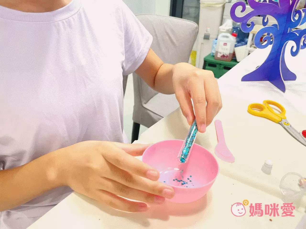 然後用攪拌棒來攪拌粉紅碗裡的亮片,讓它散佈均勻~