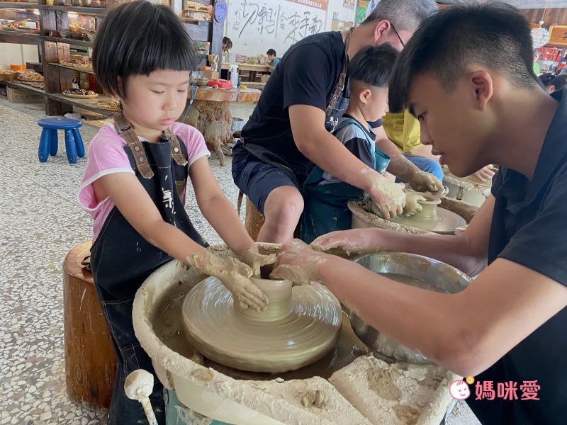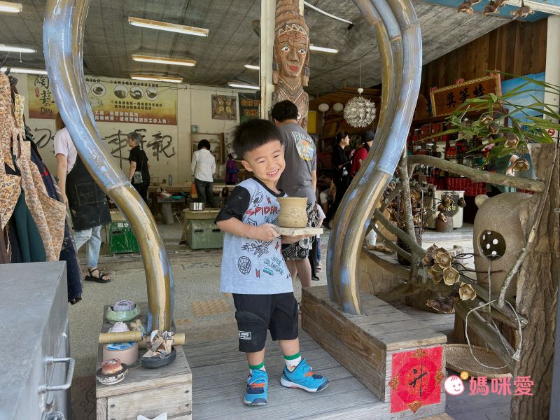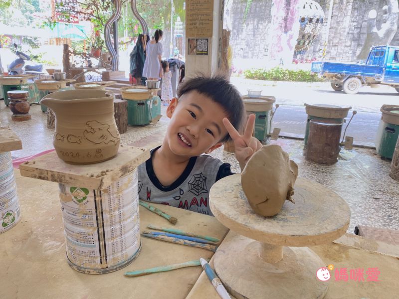 親子手捏陶的體驗兌換券可以在這裡體驗手捏陶,提供親子一起動手創作的樂趣!在拿到兩塊陶土後,老闆先請我們想好想做的樣子,也都可以參考園區裡的作品