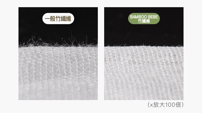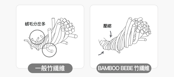來看看「一般的竹纖維材質」與「Bamboo Bebe的竹纖維材質」之間的差異。以卓越的生產技術,將壓縮過的竹纖維再一次壓縮,使表面變得更平滑、不粗糙,進而降低起毛球發生的機率!