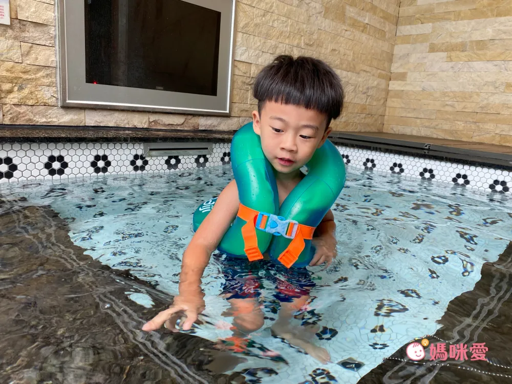 乾淨的設備和池水,深度也在大人們及腰的位置,只是潑潑水倒是還好,若需要盡情玩耍,也能自己帶泳圈或其他安全保護,我們就帶了簡單的泳圈給他們