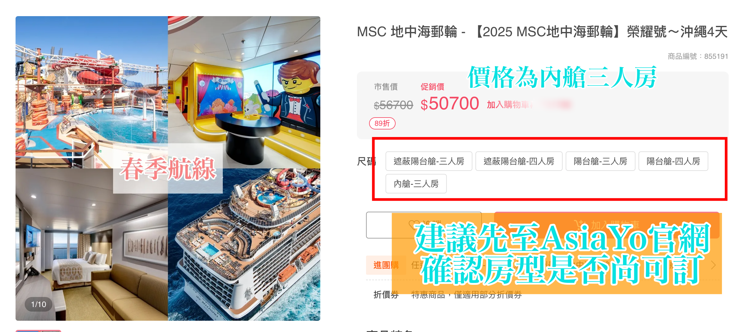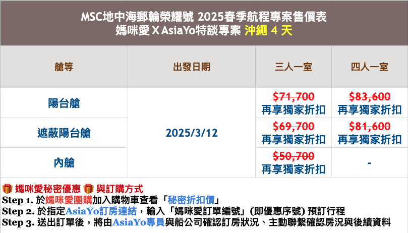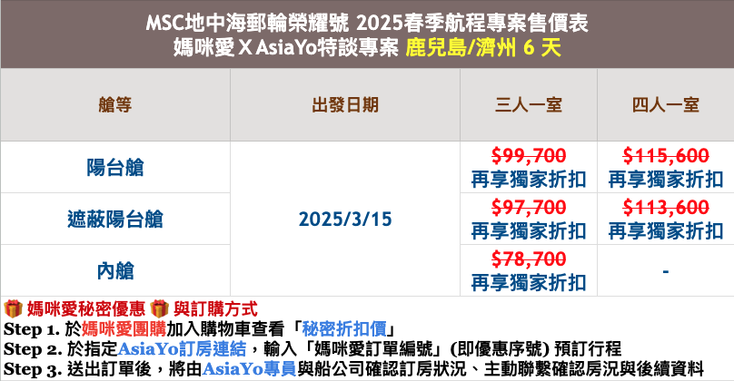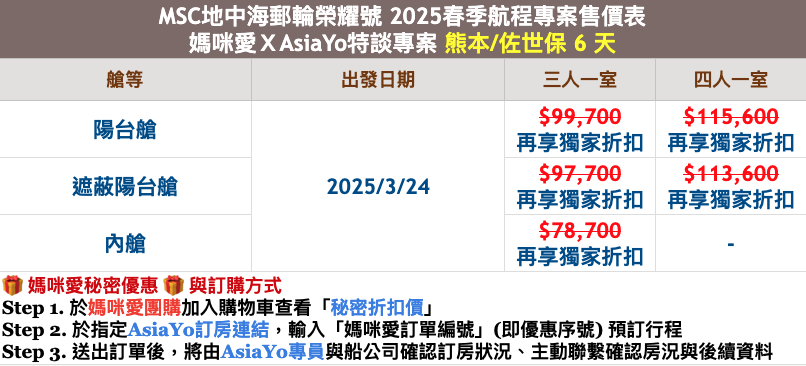 註 5:線上預約並非保證訂位成功,仍需以業務專員回覆確認為準。三人房、四人房數量有限,請及早提出需求,以免艙房向隅。
