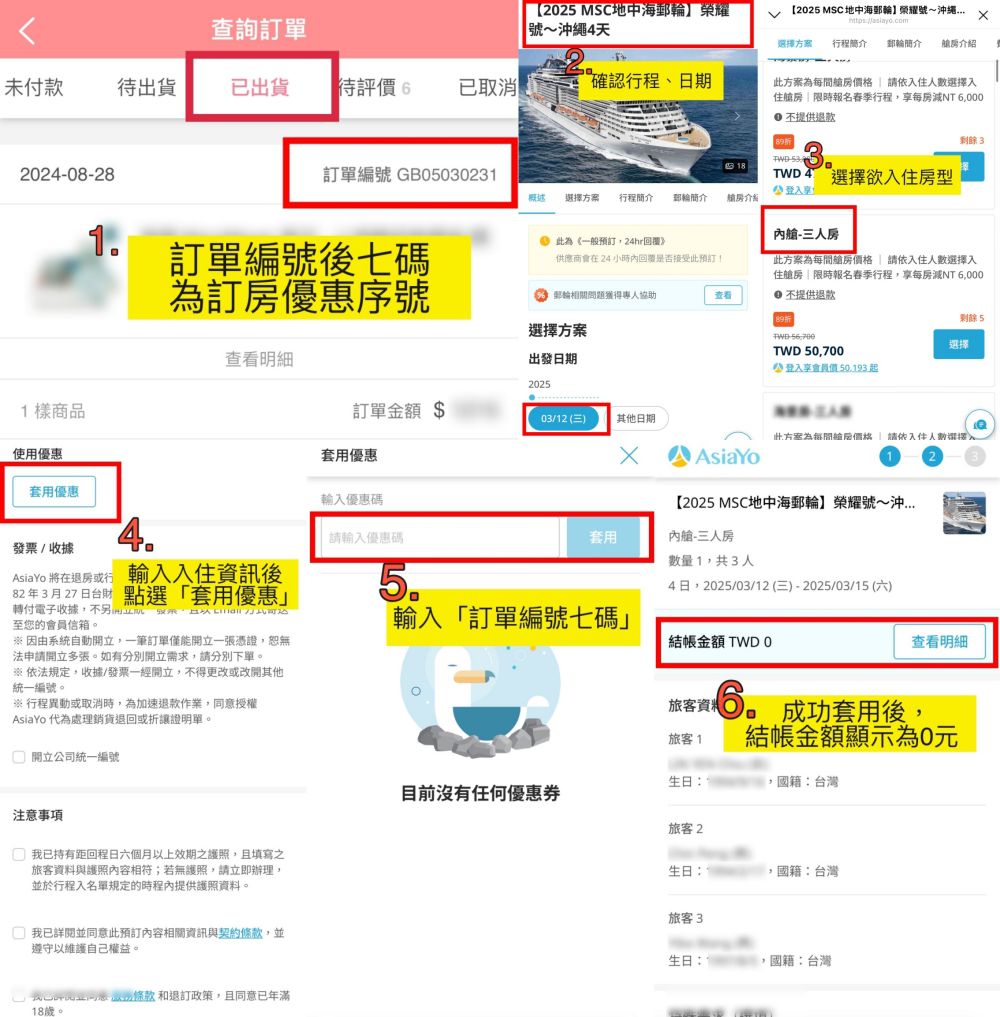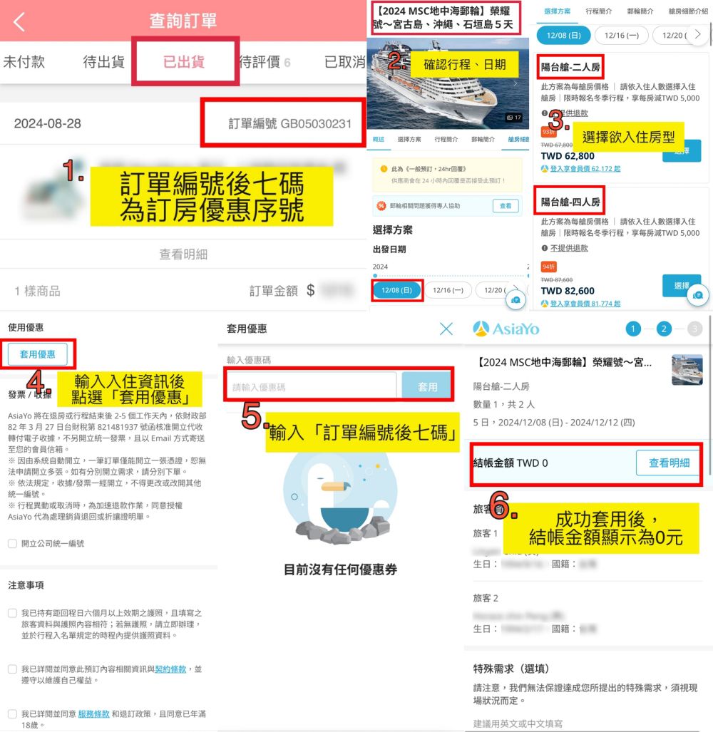 ※ 步驟4 依步驟選擇登船日期 → 於付款前點選「套用優惠」並於輸入優惠碼欄位填寫【 媽咪愛訂單編號後七碼 】→ 點選「套用」即可依本專案優惠結帳並完成訂房。