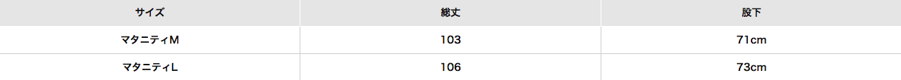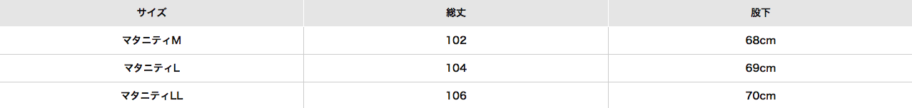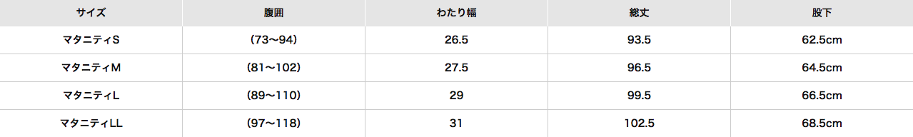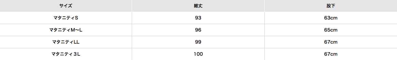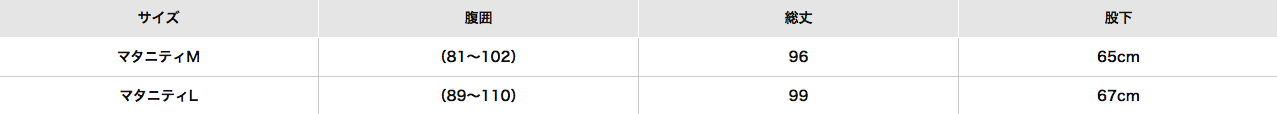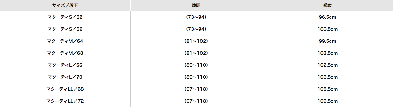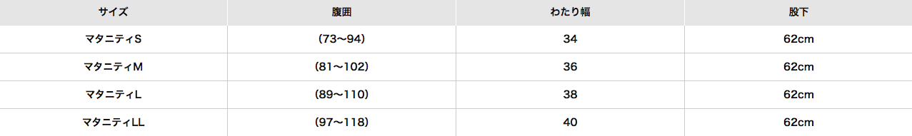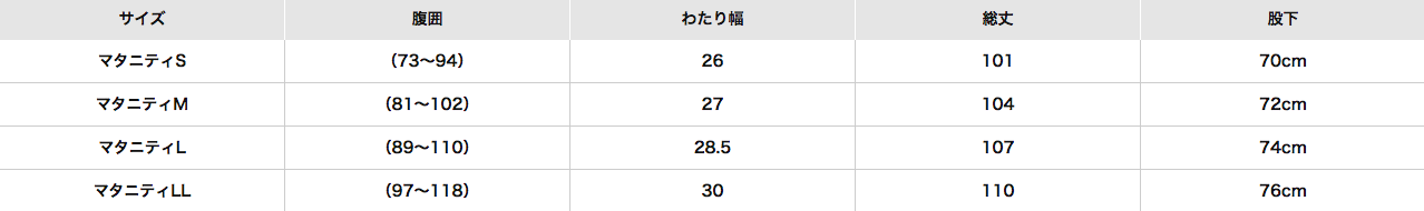 尺寸表如下,由左而右依序是腹圍、大腿寬、全長、褲襠~褲管長,供媽咪參考唷~