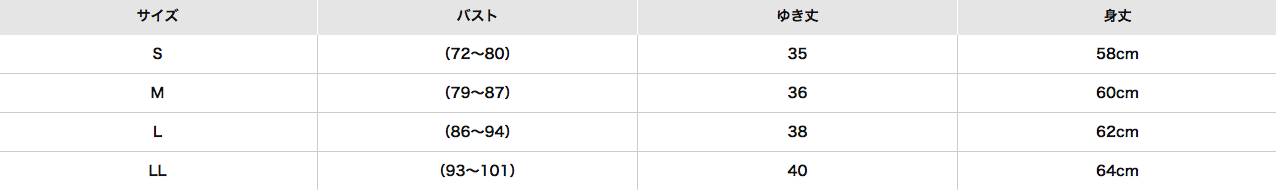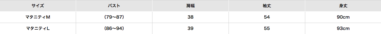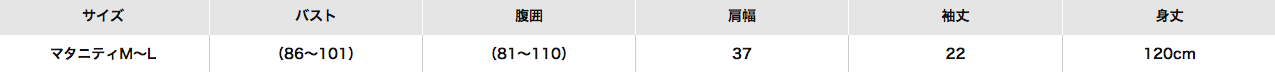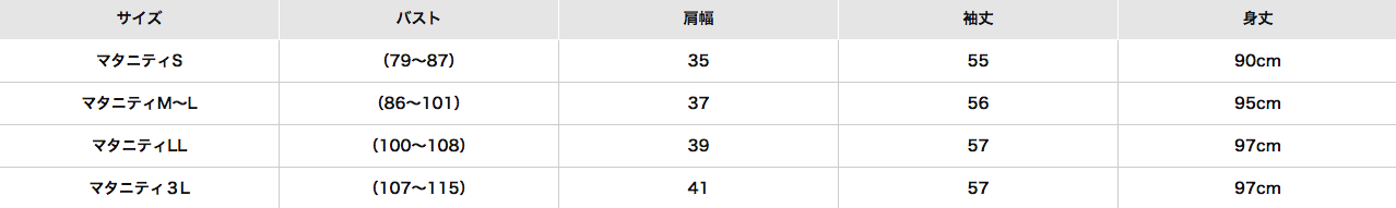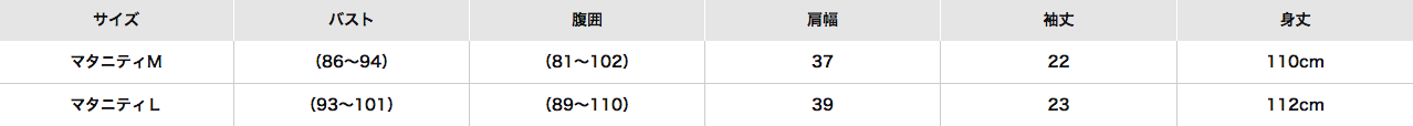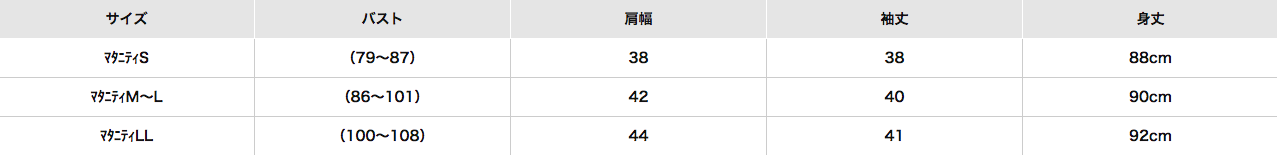 尺寸表如下,由左而右依序是胸圍、腹圍、肩寬、袖長、衣長,供媽咪參考唷~