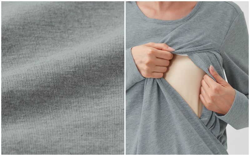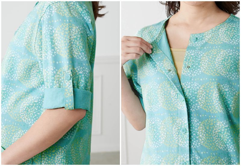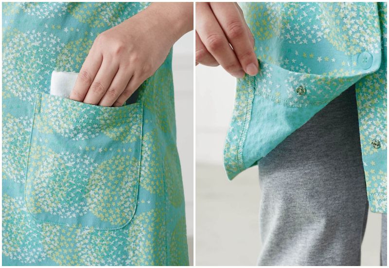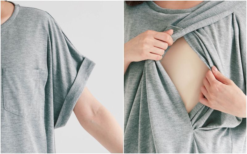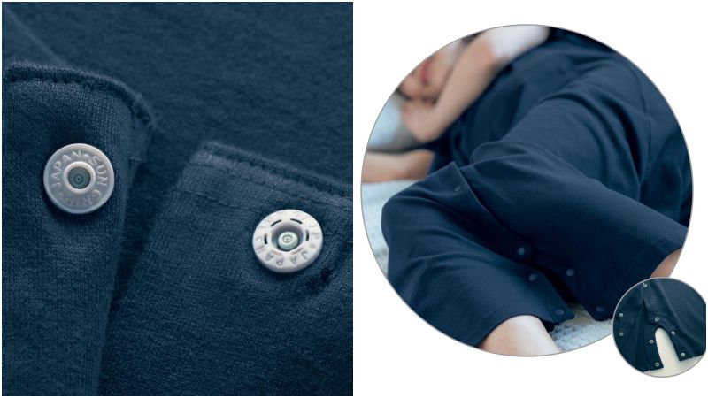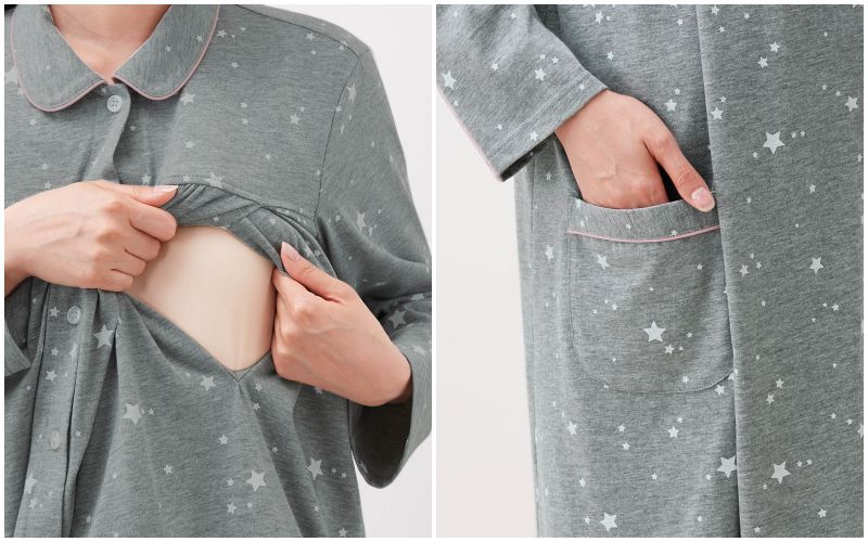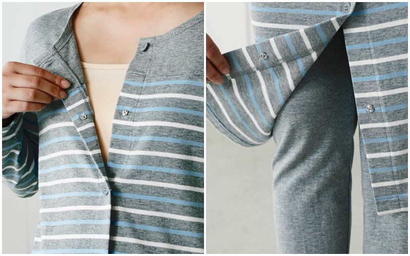 開扣設計方便哺乳。手臂部分也做有扣子,在醫院打點滴時也比較方便、不卡卡。