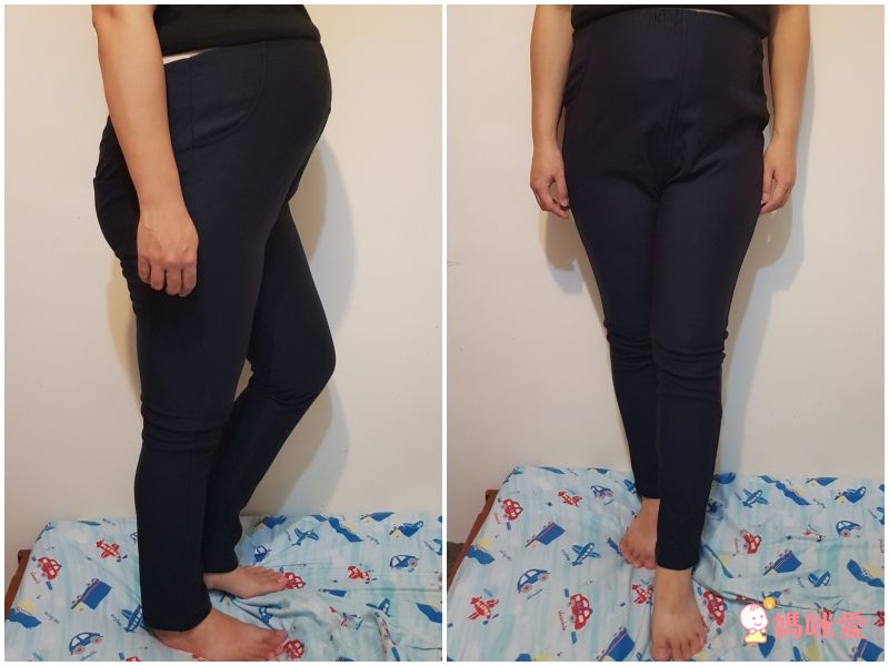 花生米媽懷孕28週,肚圍98cm、臀圍104cm、大腿圍55cm,穿 L 號合身剛好,但腹部和臀部都還有彈性與空間。花生米媽大讚:「這款的腹部的設計不像一般的孕婦褲有調整帶,所以也不會有磨肚子、癢癢的問題。而且雖然腹部的部分不是完全貼合,但上襬也不會因此而滑落喔!」(因為穿過別款的一直掉而有感而發><)