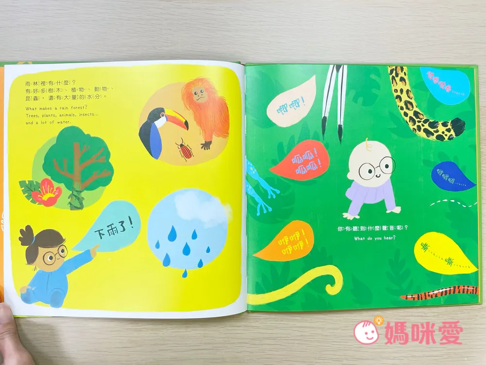 雨林的豐富生態系:書中描繪了雨林中獨特的動植物,例如樹蛙、巨嘴鳥、藤蔓植物等,幫助孩子認識熱帶雨林的多樣性。
