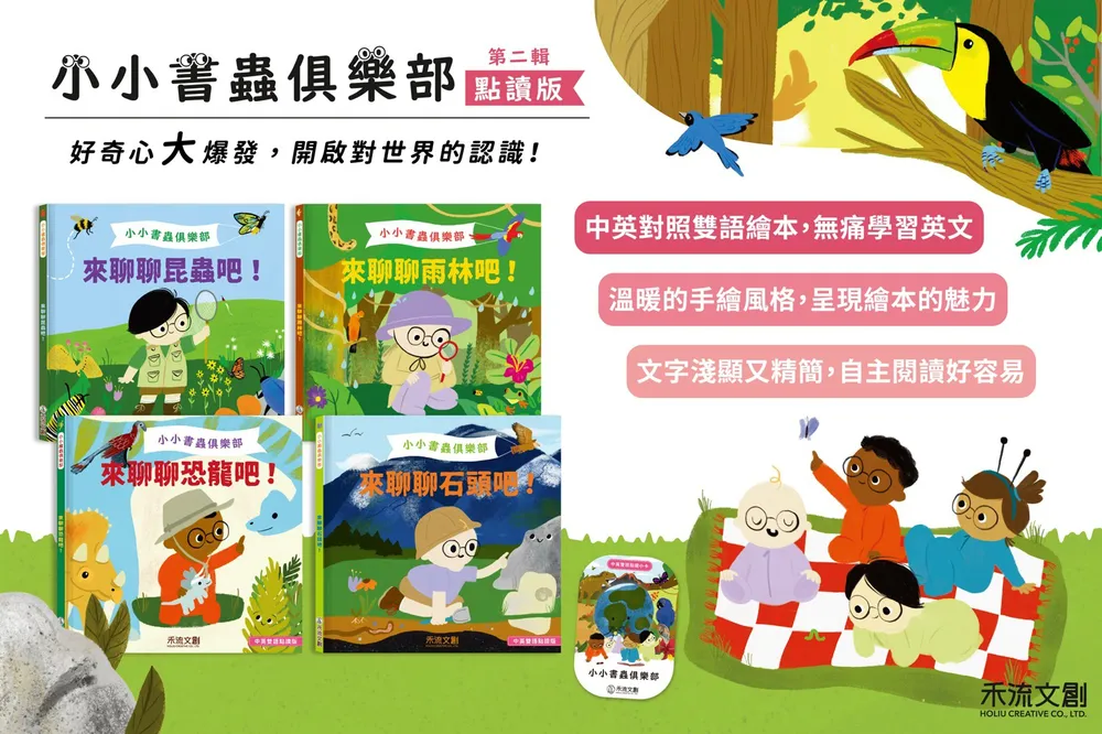 小小書蟲俱樂部 第2輯針對昆蟲、雨林、恐龍與石頭四大主題,利用點讀功能的互動效果,讓孩子不僅能在閱讀的過程中不只是「看書」,而是「參與其中」。