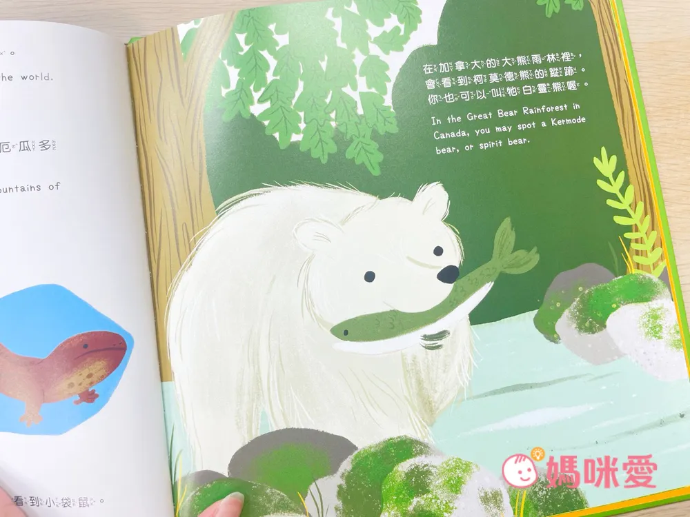 還有這頁超可愛!在加拿大的大熊雨林裡會看到柯莫德熊的蹤跡。你也可以叫牠白靈熊哦!