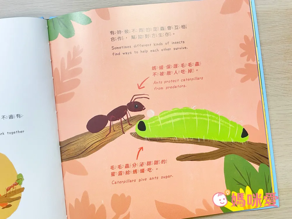 昆蟲的生活習性:用簡單易懂的方式介紹昆蟲的生活環境、食物來源和成長過程,例如蝴蝶的蛻變或蜜蜂的採蜜過程,激發孩子的好奇心,也讓扉扉從書本中汲取這些知識後,到生態觀察課實際觀察時便能馬上將書中的知識結合觀察。