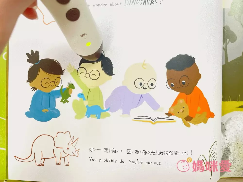 再來最吸引孩子注意的就是那恐龍音效的生動模擬:點讀功能帶來恐龍的咆哮聲或腳步聲豐富孩子們的感官體驗,這些音效讓希希閱讀時忍不住跟著吼叫起來呢!
