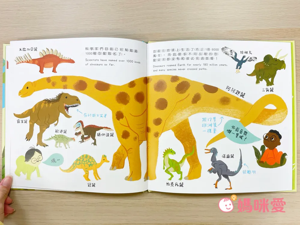 這本豐富介紹了恐龍的種類:從暴龍、三角龍到迅猛龍,書中涵蓋了多種恐龍,並用簡單的文字介紹它們的特徵、生活習性與大小比較。