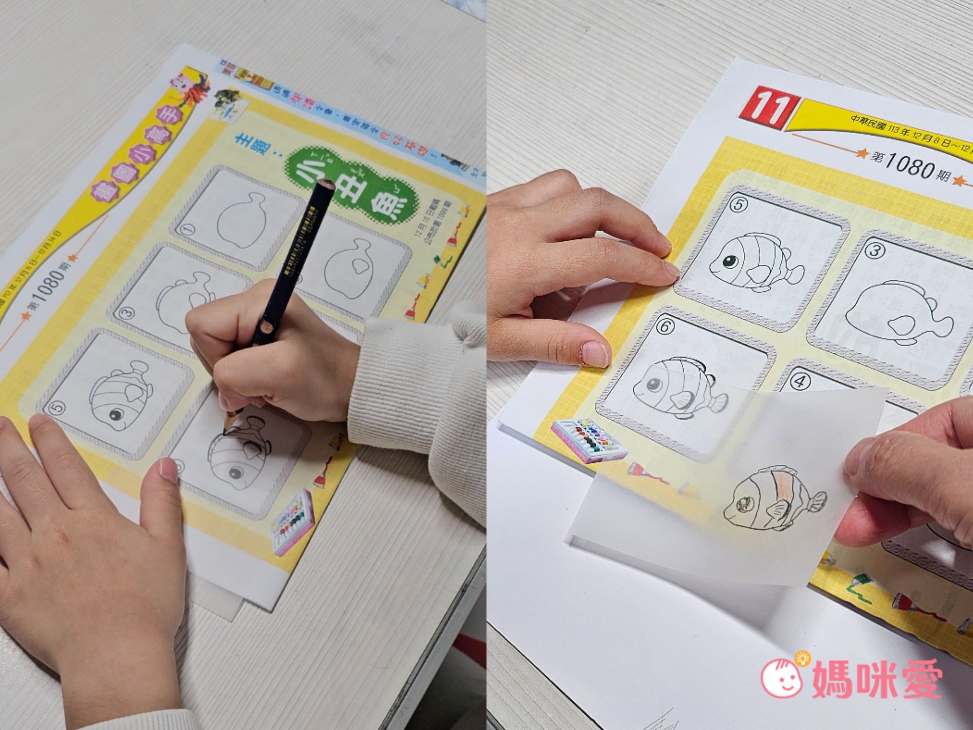 妹妹想再畫一次小丑魚,就撕下一張覆蓋在小丑魚圖案上(左圖),開始重新描繪、上色。噹啷~又一隻可愛的小丑魚出現了(右圖)!