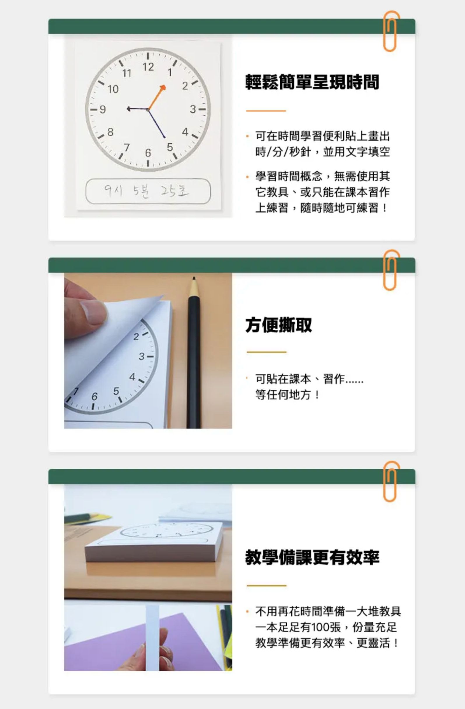 直接看著時鐘畫出或讀取時間,對孩子來說其實有點困難。於是偉大的小學老師就設計出這款時鐘學習便利貼。簡單實用,方便孩子輕鬆理解時間概念、提升教學效率。無論是上課或課後練習,都能透過這張紙畫出時/分/秒針、讀出時間,使學習變得更輕鬆!