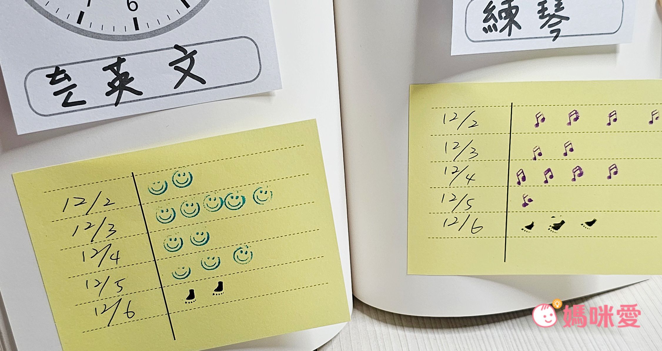 媽媽我也會拿幾張貼在孩子的每日進度表作紀錄用:今天聽英文表現很好就在便條紙上蓋章,章愈多表示表現愈好XD