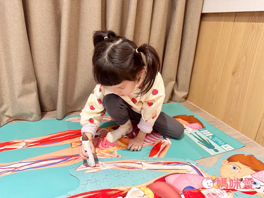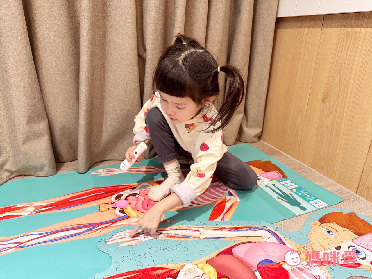 還可以搭配點讀互動遊戲卡,一邊聽遊戲一邊再去點拼圖過程中,邊玩邊認識身體的部位,拼圖對妹妹來說很有挑戰,但是互動遊戲卡,可以自己準確地找到答案哦。![]()