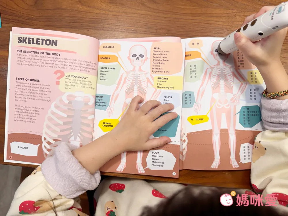 妹妹自己兩本書邊對照邊中英同時進行點讀,在點圖過程中也會問問題『媽媽什麼是棕髮,是去染的嗎?』邊互動問答下學習到關於人體的小常識~![]()