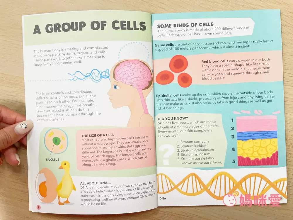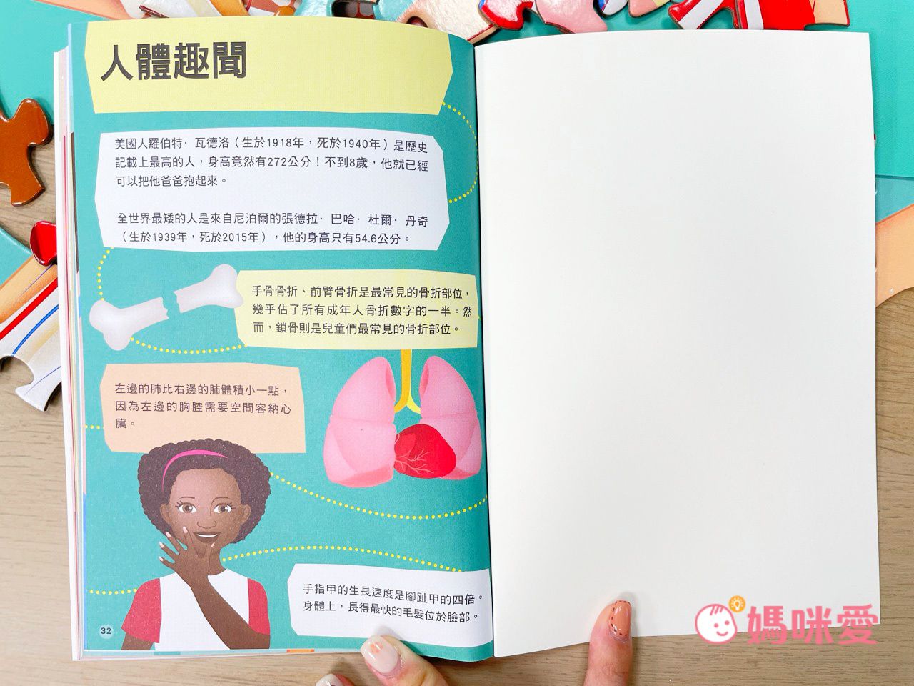 書中還分享人體的一些小趣事,像是歷史上記載最高跟最矮的人分別是272公分和54.6公分;手骨和前臂是最常見的骨折部位;左肺比右肺的體積小一點等等⋯⋯連媽咪平常都不知道的知識,和孩子一起共讀後也學到了很多~![]()