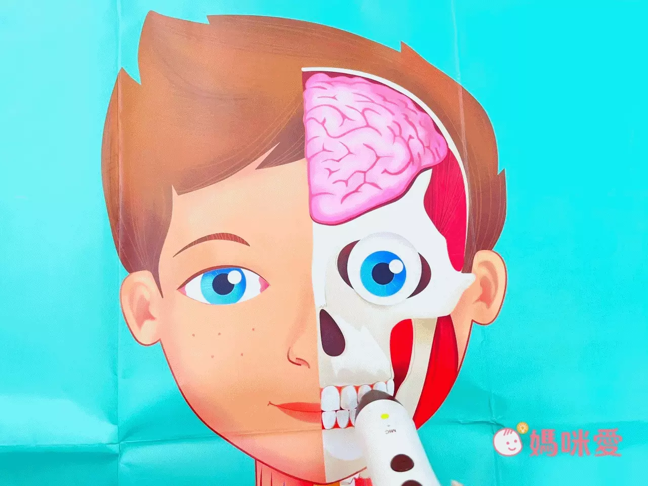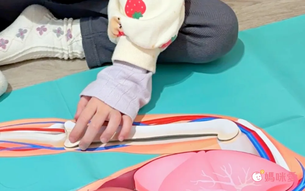 拼的過程中,爸爸告訴他們小絕招:把骨骼和肌肉先分類,看著海報一步一步慢慢拼。進一步告訴孩子們這器官是什麼、在身體哪個部位,一邊邊認識身體構造,一邊搭配點讀聽聽看。![]()