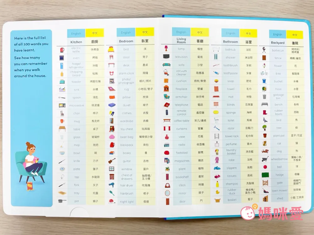 5個生活場景:後院、浴室、客廳、廚房、臥室。廚房裡,有很多電器,你有找到oven嗎?媽媽陪我在浴室刷牙,我會擠toothpaste⋯一起來看看有哪些物品吧!