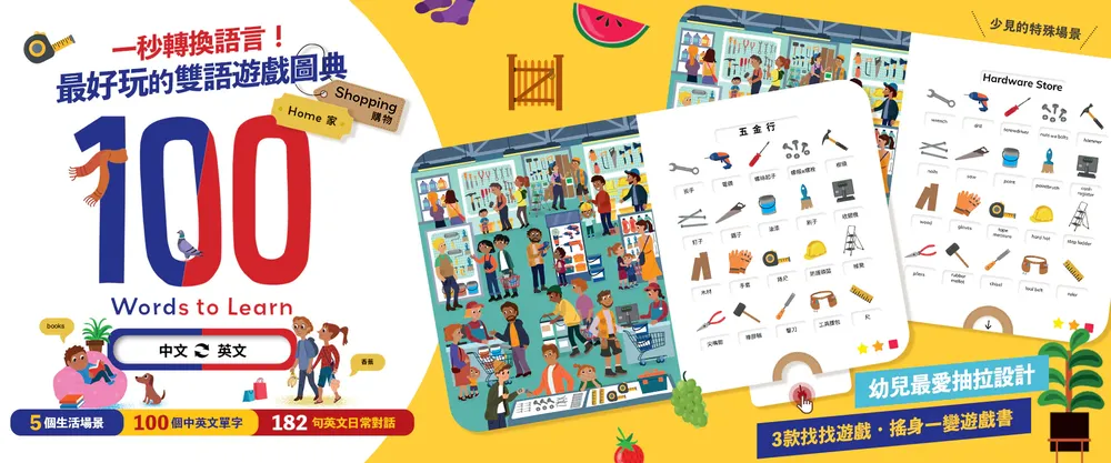 1秒轉換語言!會讓人想一玩再玩的《雙語遊戲圖典》😍共有2種主題(Shopping購物、Home家)x5個場景x100個中英文單字x182句英文日常生活對話🗣️![]()