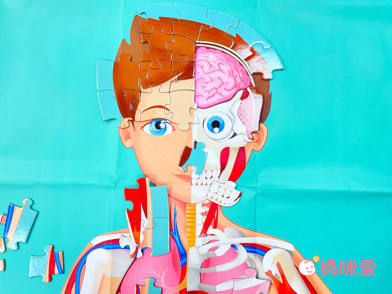 不只這樣!這些拼圖還有設計小巧思,在210塊拼圖中,有10片本身形狀獨特,面積較大的原寸拼圖分別是:一側的大腦、眼球、心臟、一側的肺、肝臟、小腸、肱骨、肱二頭肌、手部與足部。![]()