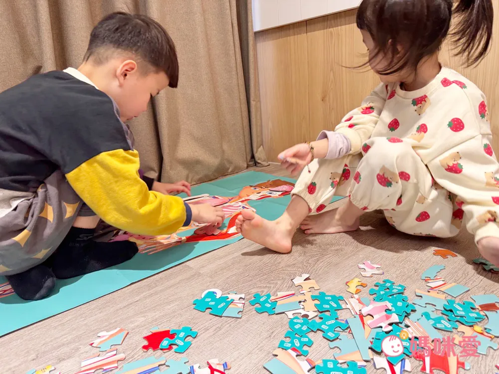 一開始芙咪和哥哥想嘗試自己完成拼圖,拼到一半哥哥說:這真的太大了,130公分快跟我一樣高了!![]()