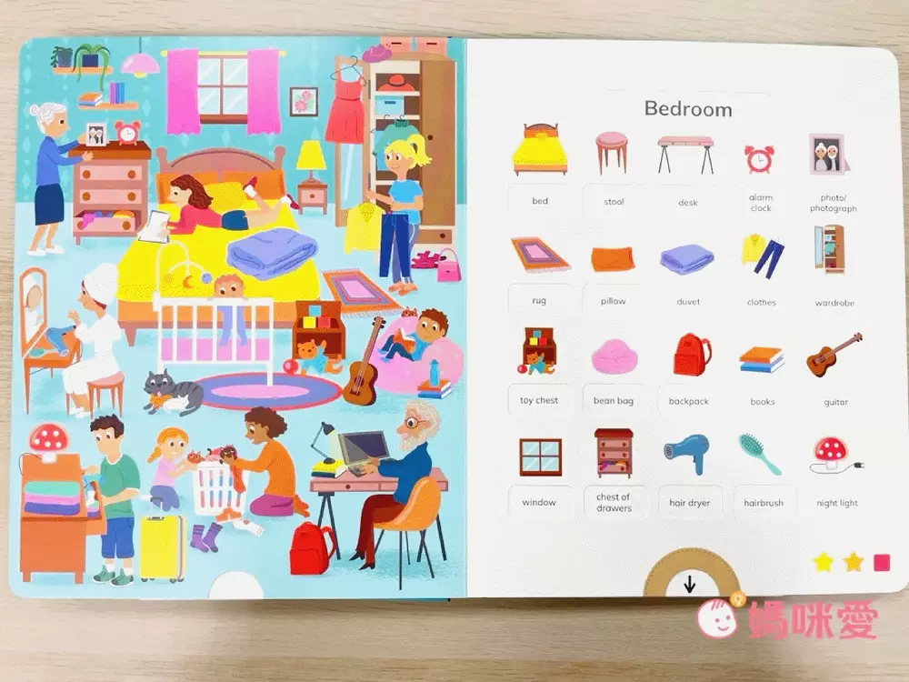搭配獨家趣味3種找找遊戲(共有318題),針對孩子的學習程度,有不同程度的找找遊戲👉點擊單字上的插圖:根據圖片找找物品;點擊黃星:聆聽問句找找物品;點擊橘星:聆聽問句找找人物🔍