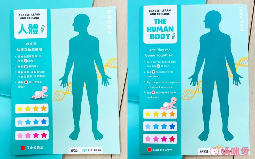 雙語互動點讀遊戲卡:每個星星共有3個不同的題目,正反各一種語言,一面各有12個星星,中文/英文題目加起來共有72題。